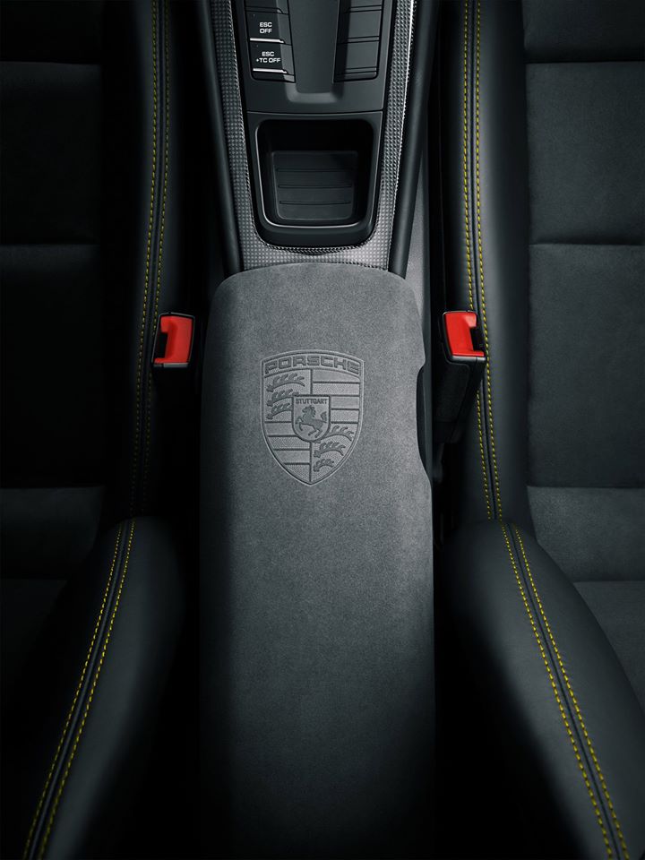 The seats and the steering wheel are inspired by those of the Porsche 918 Spyder, both wrapped in a blend of Alcantara and leather. Yellow decorative stitching – on this model – adorns pretty much every surface that’s covered in leather. The seat belts are also yellow which add to the sporty feel of the cabin.