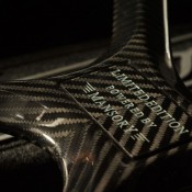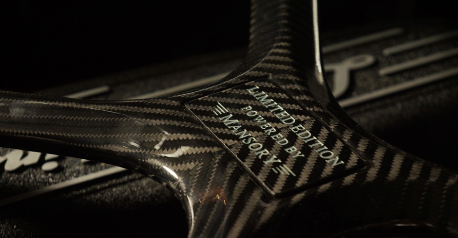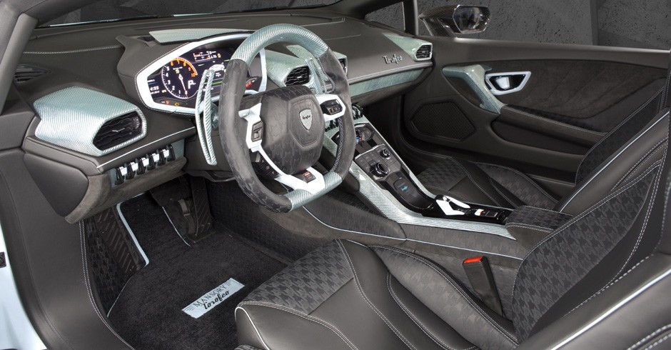 Interior package consists of leather an Alcantara seat upholstery with unique pattern, suede steering wheel, light blue carbon fiber trim pieces, and Mansory floor mats.