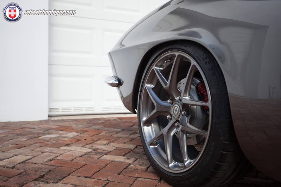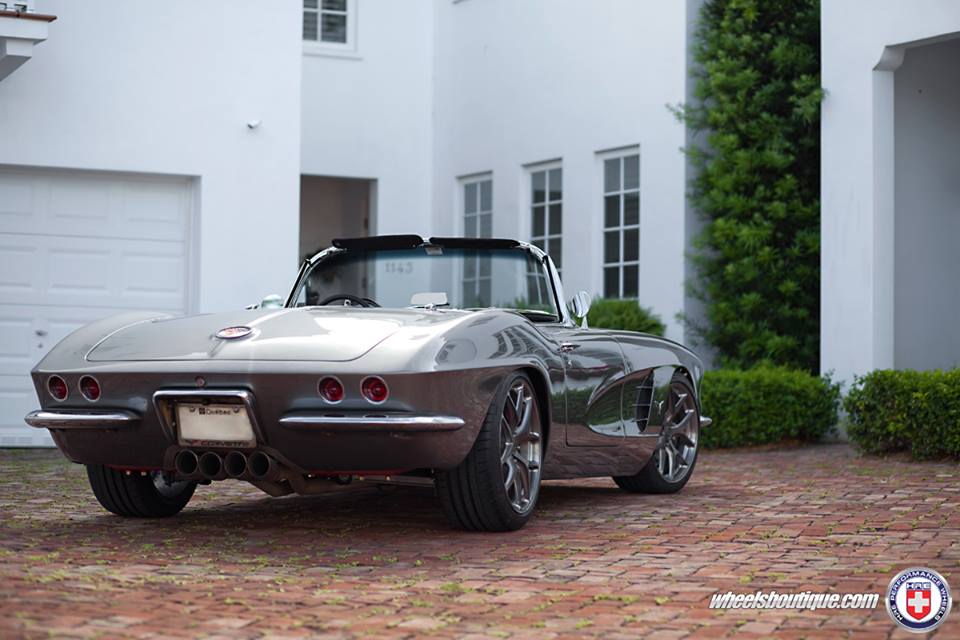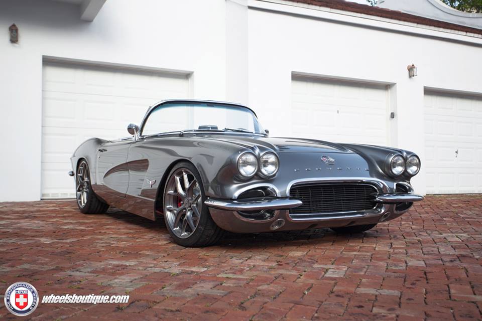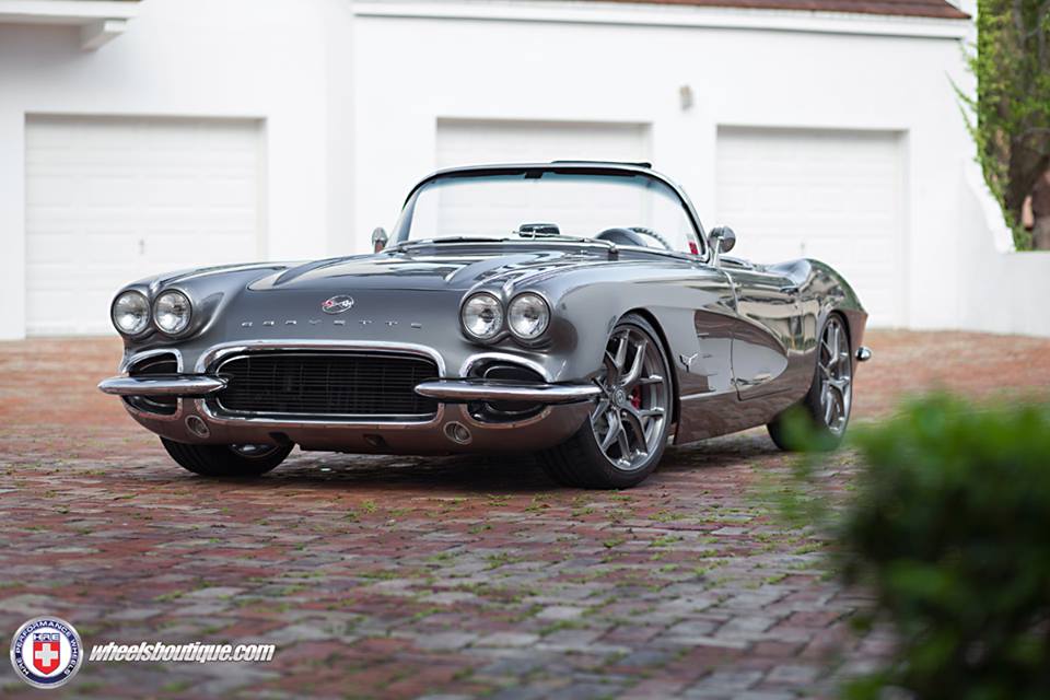 In preparing this Corvette C1 restomod they have maintained some elements of the original design, such as the chrome mini bumpers, and altered some of the others, such as the front grille, for the sake of a sleeker look. The car is also lowered, nay, slammed on a set of brushed/tinted clear HRE P101 wheels. Those wheels are the only sign to let an untrained eye know this car has modern underpinnings.