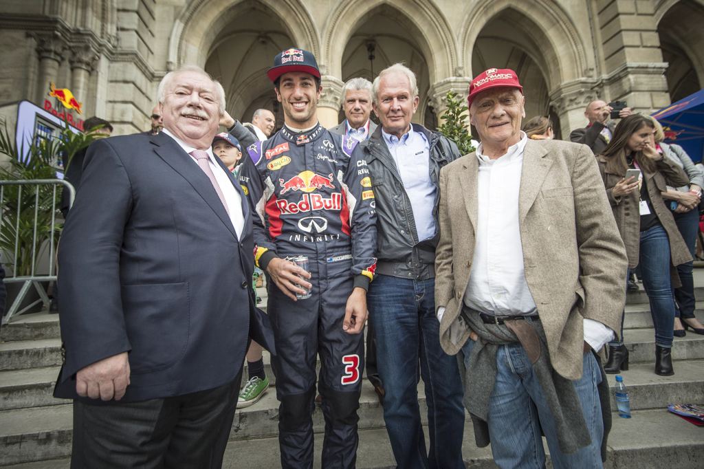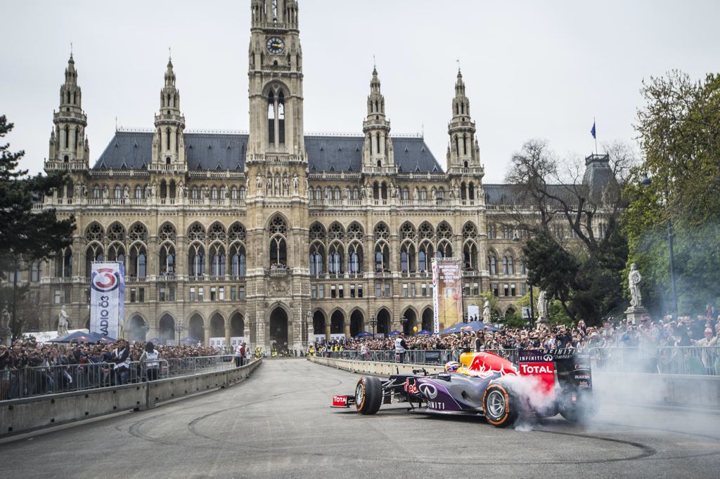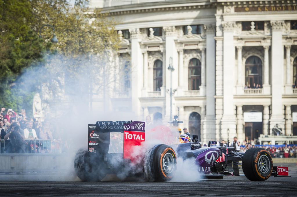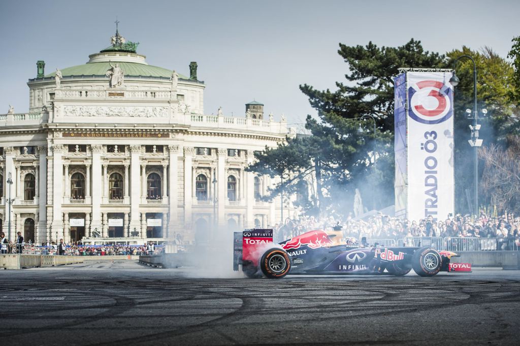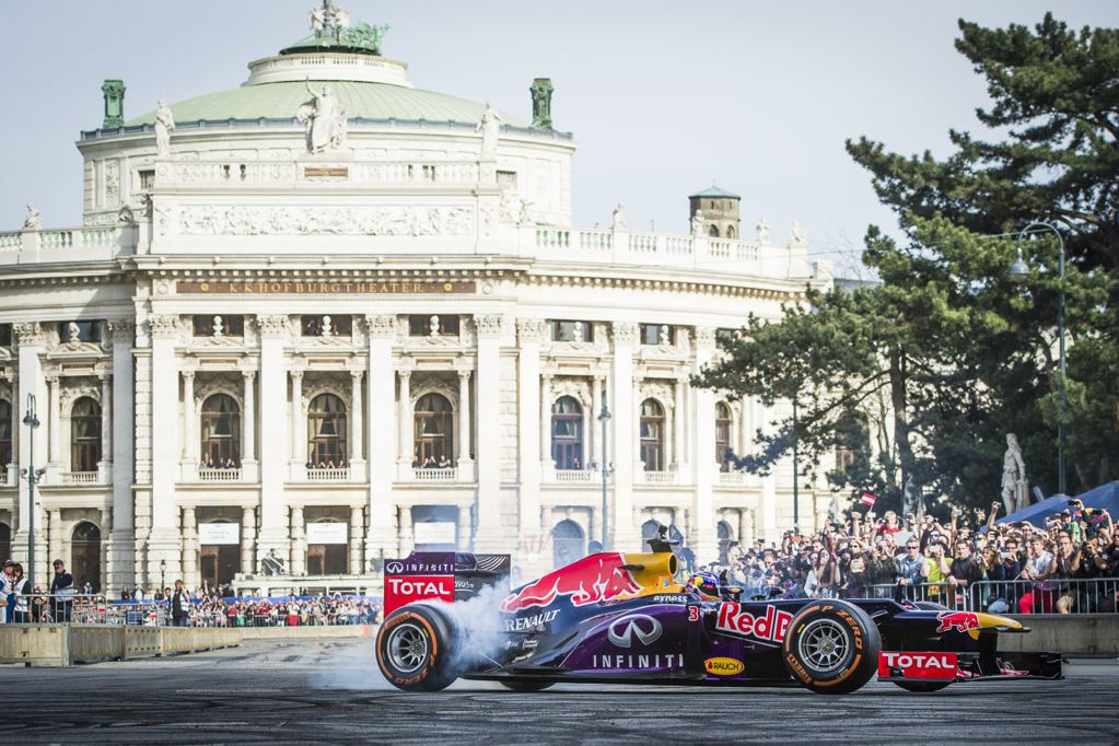 Once in Austria they went straight to the historic Vienna Rathaus which is the appropriate place to go if you want to waltz. But then somebody noticed there is a nice patch of asphalt in front of the venue. So they went there instead, letting loose Daniel Ricciardo in an RB8 racer to do all sorts of crazy things. Turns out this is a lot cooler than slow dancing to Chopin’s nocturnes.