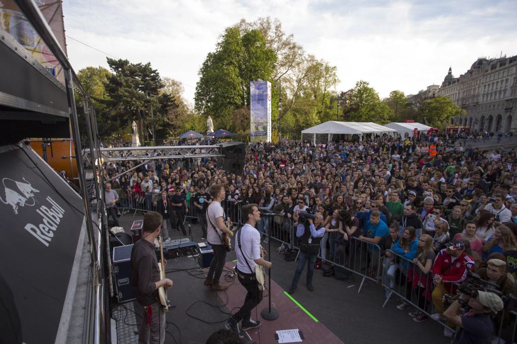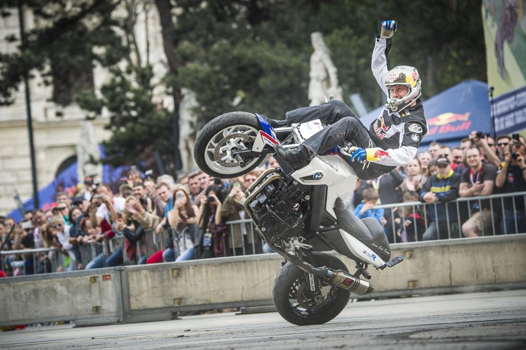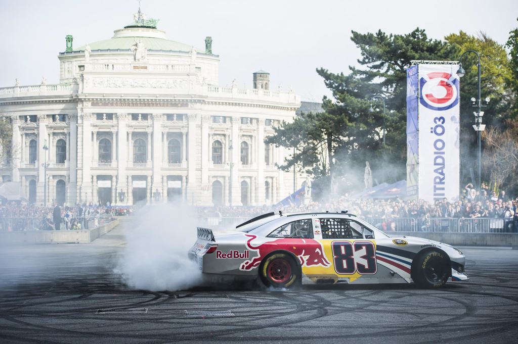 Red Bull Live Demo display in Vienna also includes stunts by enduro and trials rider Chris Pfeiffer on his bike and GP2 driver Pierre Gasly who went berserk in a NASCAR racer. The show attracted a crowd of 60,000 people, among them Gerhard Berger, Dr. Helmut Marko and Niki Lauda who came to help publicize the upcoming Austrian Grand Prix.