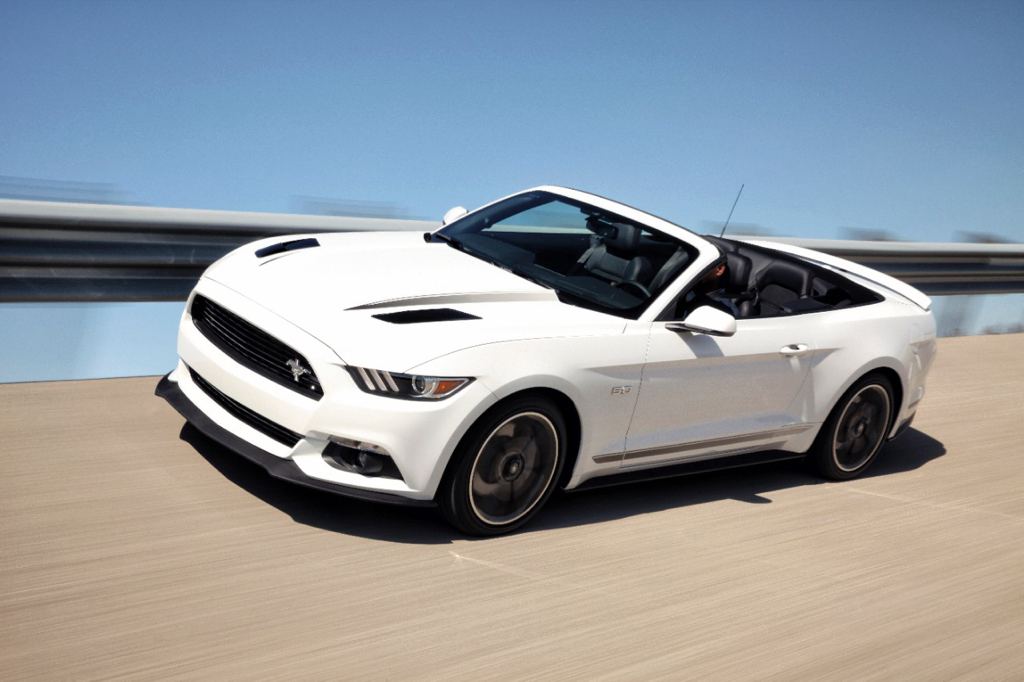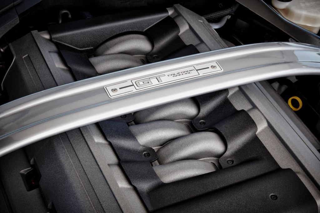 Mustang GT Premium buyers will also have the option of the California Special Package, the main features of which include 19-inch ebony wheels, ebony leather/Miko suede seat inserts with red contrast stitching and embossed logo, unique door inserts and carpets, aluminum dashboard finish, hood and side stripes, front splitter, strut tower brace, dark taillights, and black mirror caps and vents.
