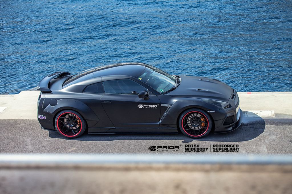 The PD750 styling package for Prior Design Nissan GT-R wide body includes 4-piece widened fenders, front bumper and front add-on spoiler, nostril-like air vents, aerodynamic side skirts, and rear diffuser. This being a wide body kit, you also have to order an air suspension system and a set of properly wide wheels and tires. Prior supplies both, and also sport exhaust system in case you fancy that too.