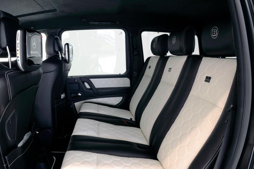 Brabus G63 700 comes with a familiar looking body kit consisting of custom front and rear bumpers, a Brabus grille, vented engine hood, smoked headlights, Widestar extended fenders front and rear, running boards, and a roof spoiler. Inside, this particular model boasts two-tone black and white nappa leather and sport pedals.
