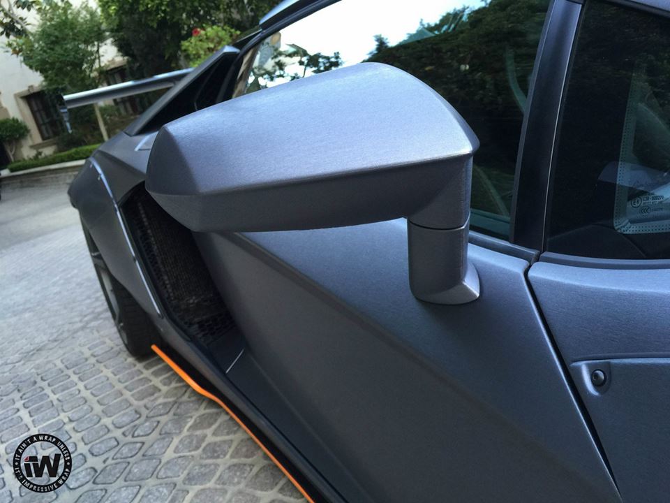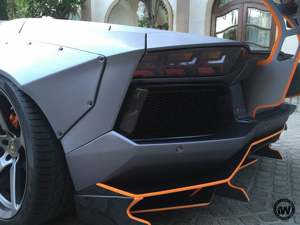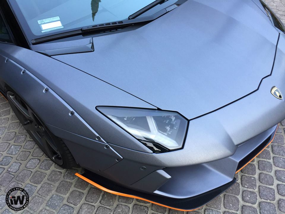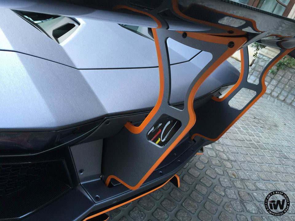 You are probably familiar with the styling kit on this wide body Aventador which consists of large, bolt-on front and rear fenders, custom front and rear bumpers, giant rear spoiler, and a full set of aero parts garnished in this case with orange accents. The CEC wheels they have chosen for this car though look somewhat too sober for the design, especially as they’ve gone ahead and wrapped the whole thing in unique Brushed Steel.