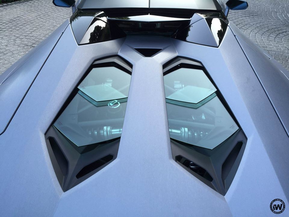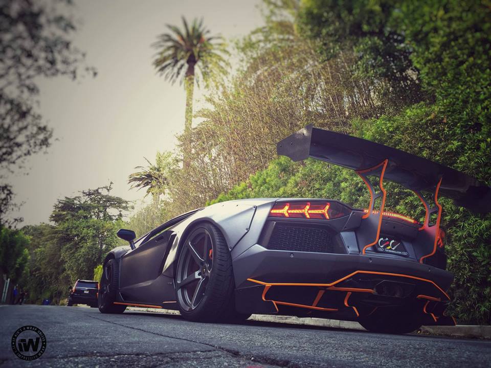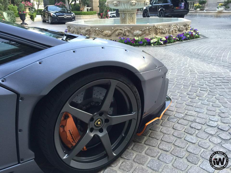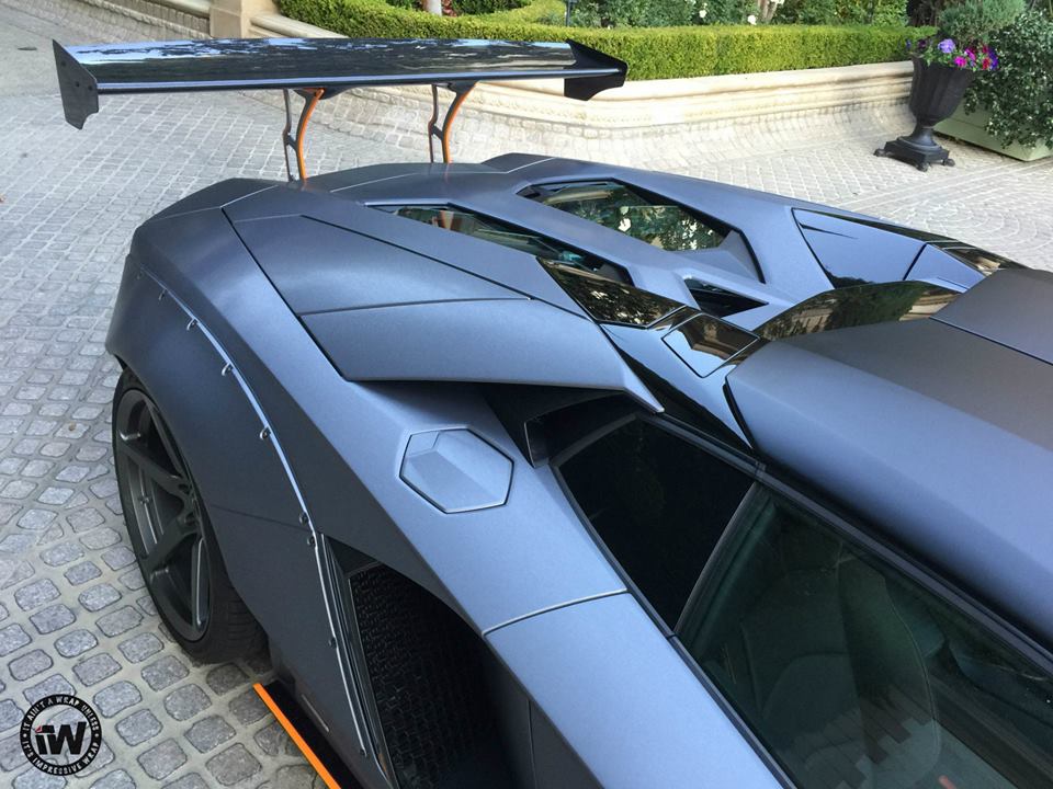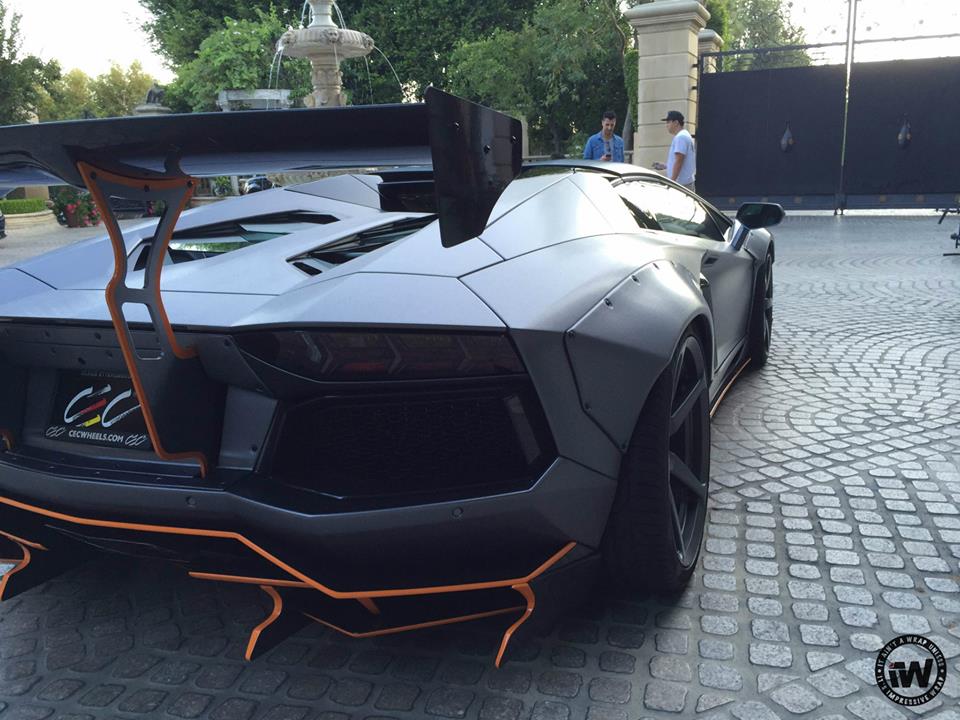 You are probably familiar with the styling kit on this wide body Aventador which consists of large, bolt-on front and rear fenders, custom front and rear bumpers, giant rear spoiler, and a full set of aero parts garnished in this case with orange accents. The CEC wheels they have chosen for this car though look somewhat too sober for the design, especially as they’ve gone ahead and wrapped the whole thing in unique Brushed Steel.