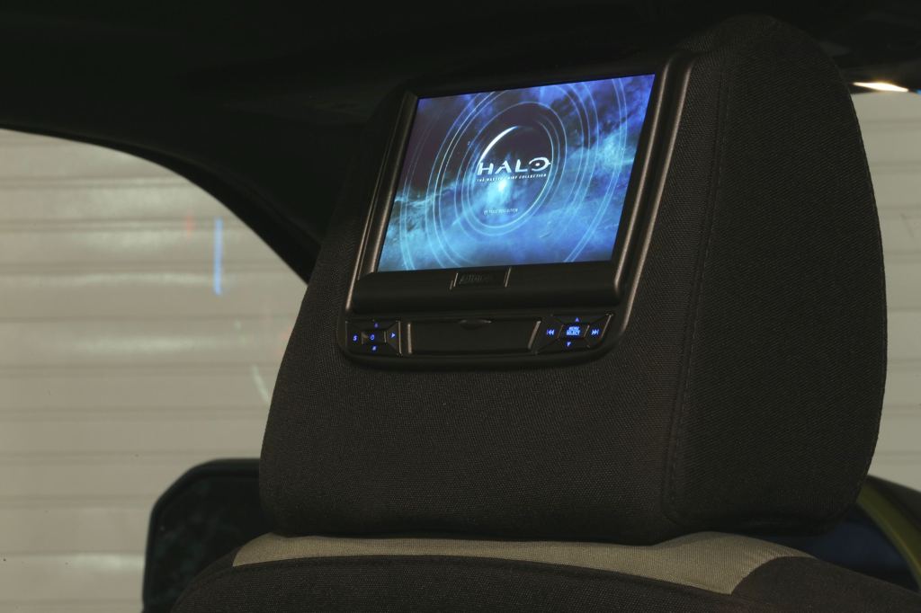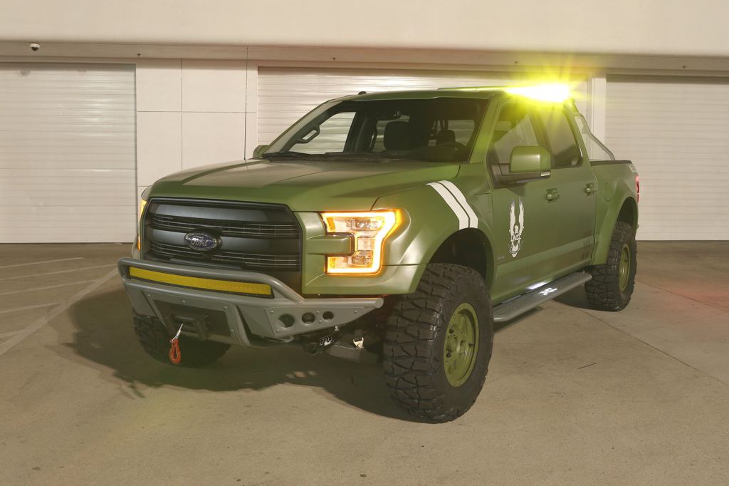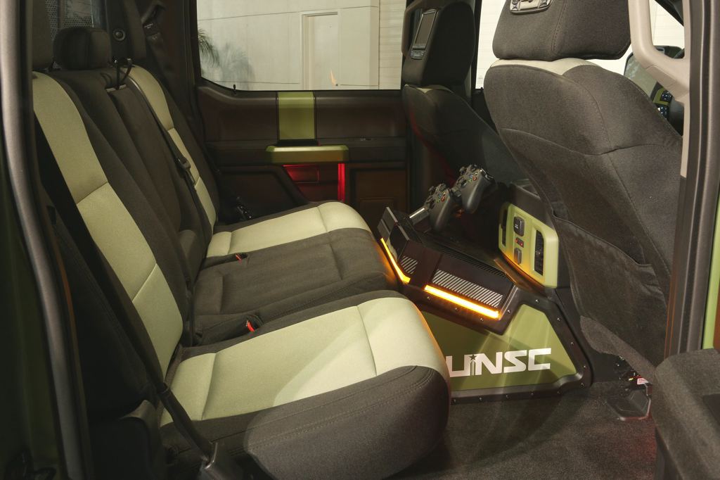 The list of mods on the Ford F-150 Halo Sandcat include Addictive Desert Designs’ Baja XTR off-road conversion kit, which includes custom FOX Racing shocks, Deaver leaf springs, a Currie full floater rear axle, ADD fenders, side steps, a chase rack and 17-inch wheels with off-road tires to go along with a full custom Halo body wrap. Inside, there’s an Xbox One custom gaming system with displays mounted in the rear head restraints.