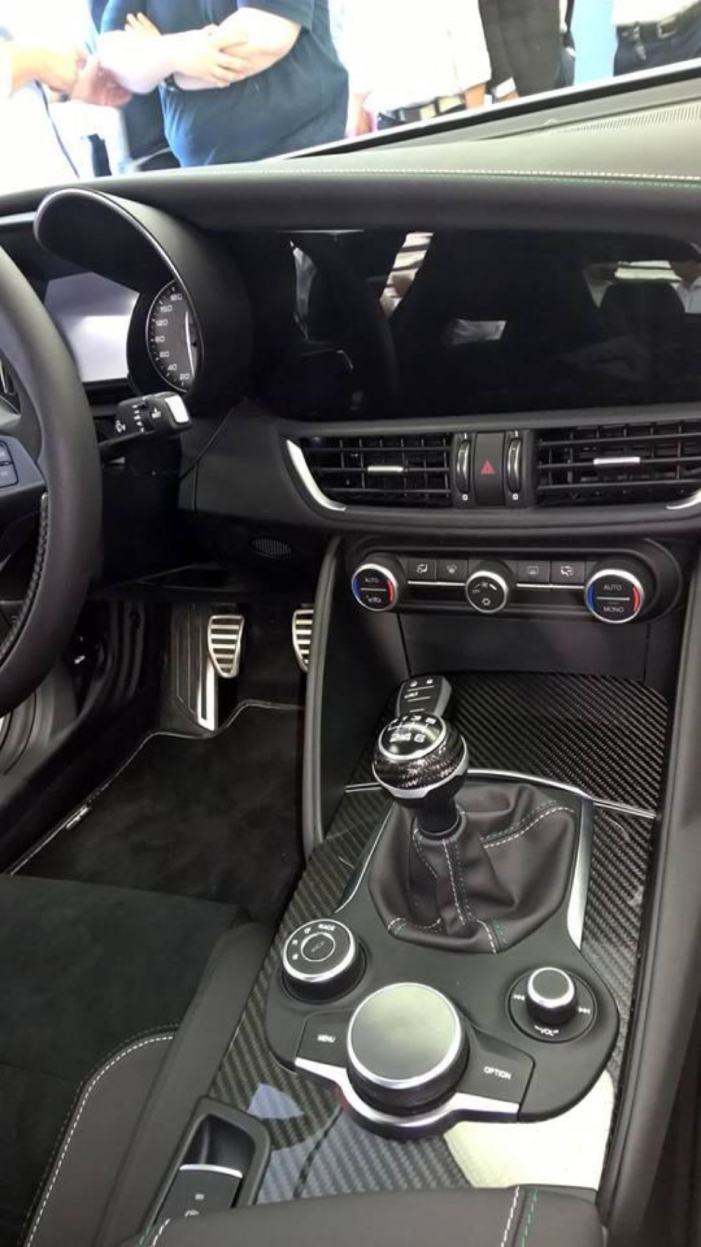 Leather and Alcantara are also used to cover the carbon fiber-backed seats, while white stitching is found throughout the cabin , adding a nice touch of sport. Mind you, all these goodies belong to the range-toping QV version. The base Giulia models will get the same design, but not as many bells and whistles.