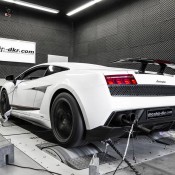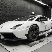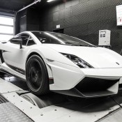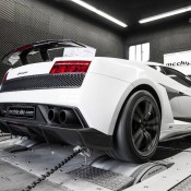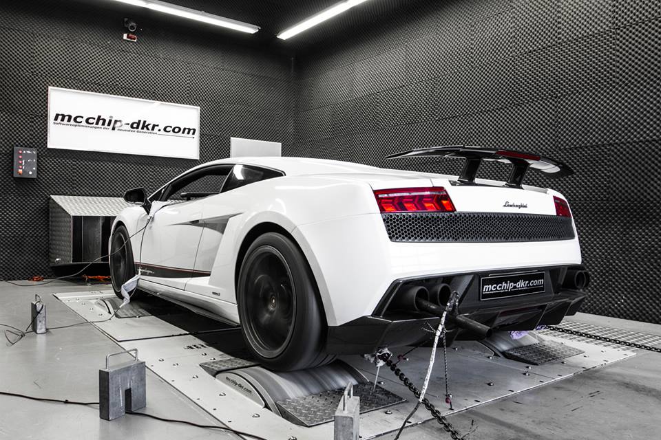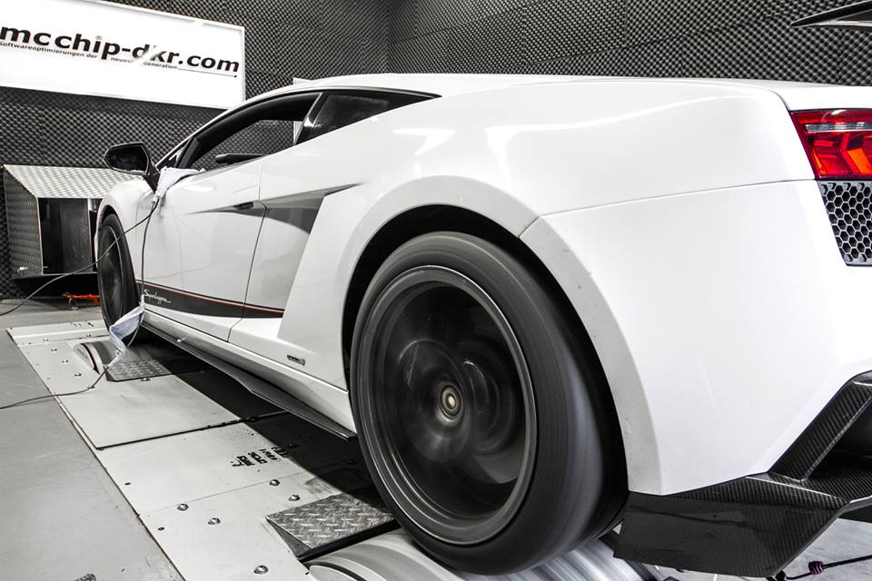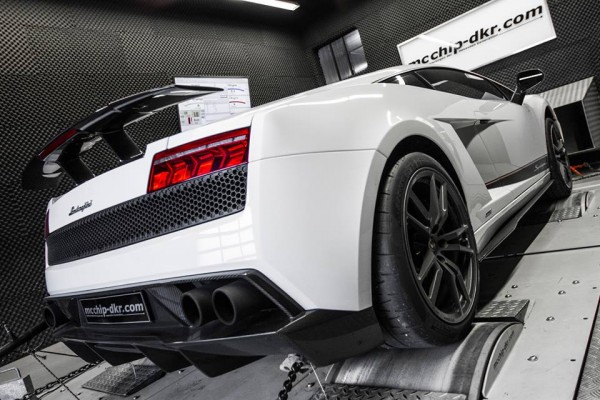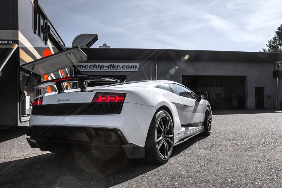 So this white Lamborghini Gallardo Superleggera Lp570 came into Mcchip’s workshop with, as the name suggests, 570 horsepower and 540 Nm of torque. There it got fitted with a new software specifically developed for this car by DKR, and also a custom exhaust system with sport cats. The result is a boost in power to 604 horsepower and 573 Nm of peak torque.