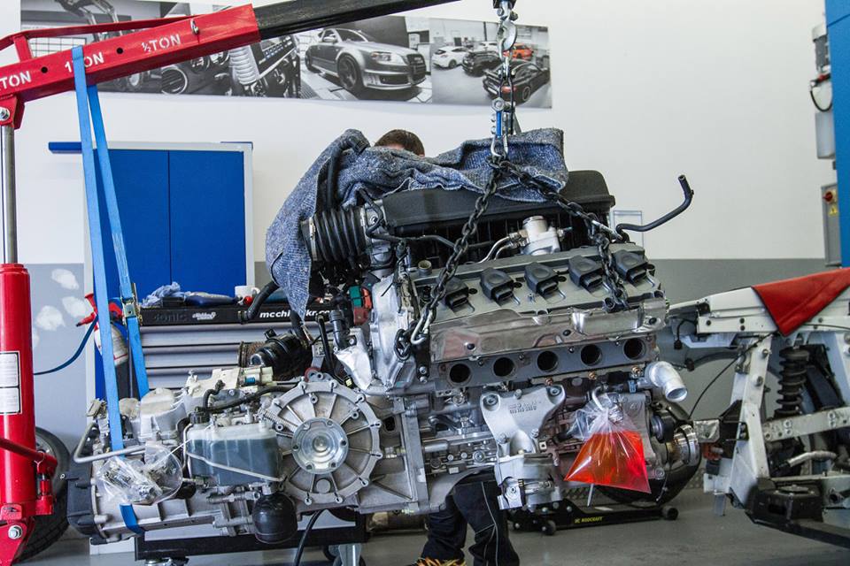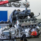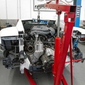 These changes may seem simple, but due to the tight packaging of this car, as you can see in the picture, Mcchip had to drop the engine out to they could get to the ECU and work on the exhaust system. So here’s your chance to see the inner parts of the Gallardo. It’s like open heart surgery!