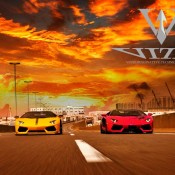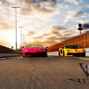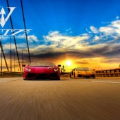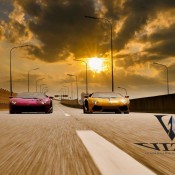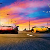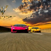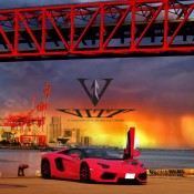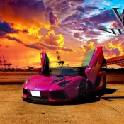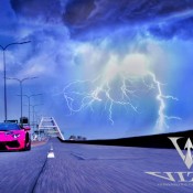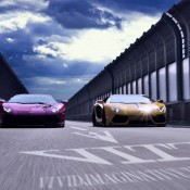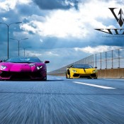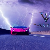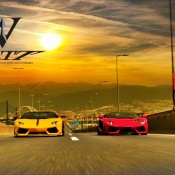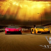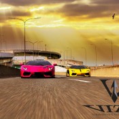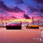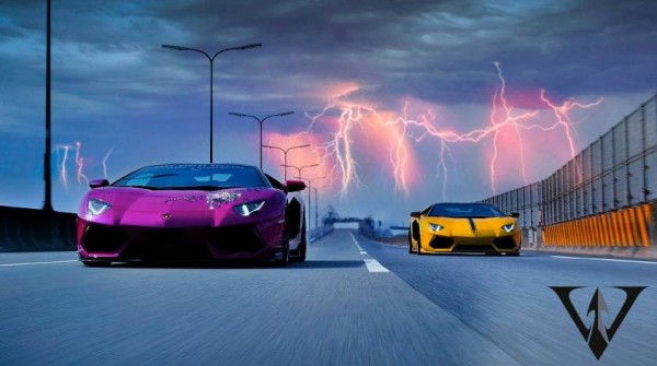 The violet-colored Vitt Squalo Lamborghini Aventador Roadster returns for a new showing off session, this time with a number of artistic photos. These heavily edited pictures show the Squalo in company a yellow Aventador, and together they apparently cause armageddon.