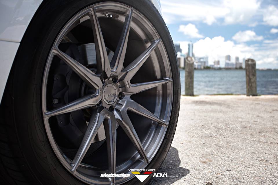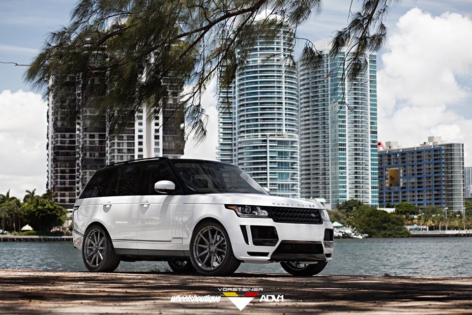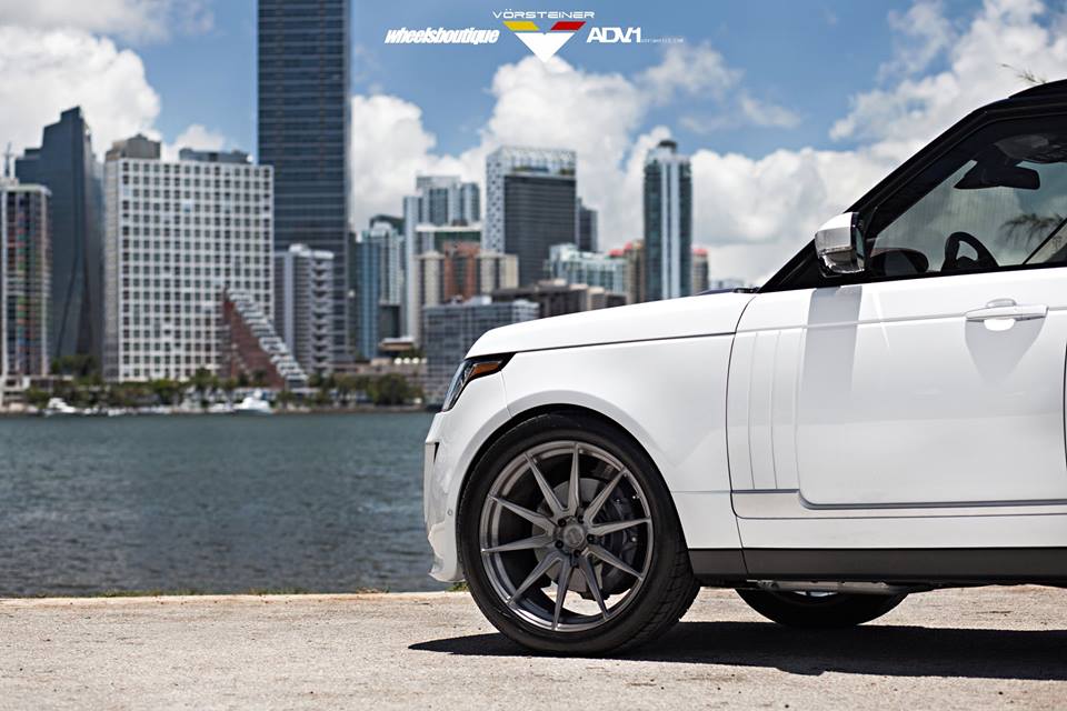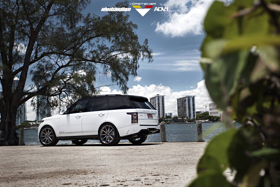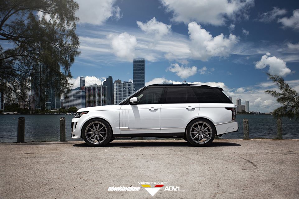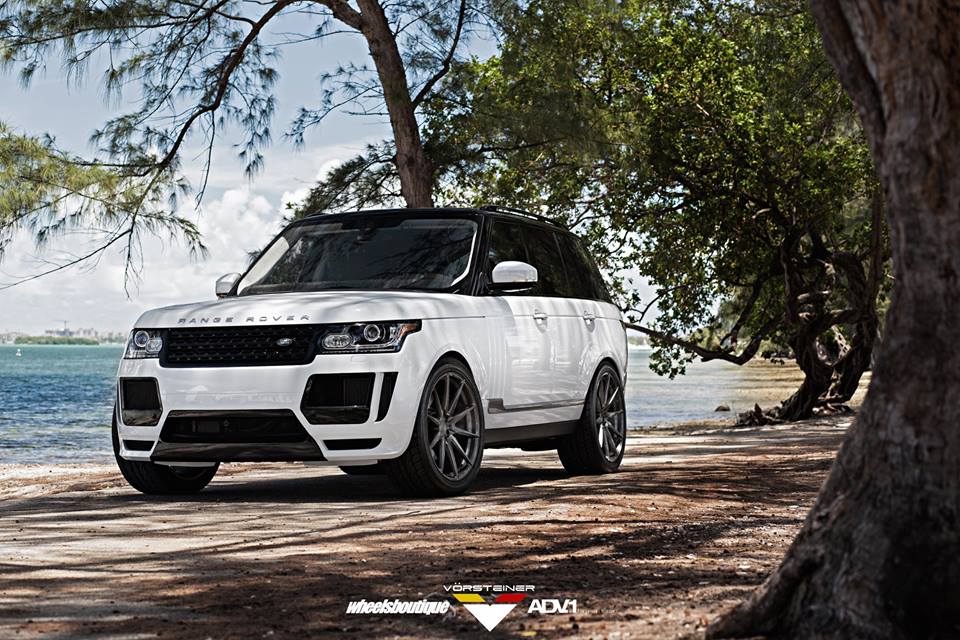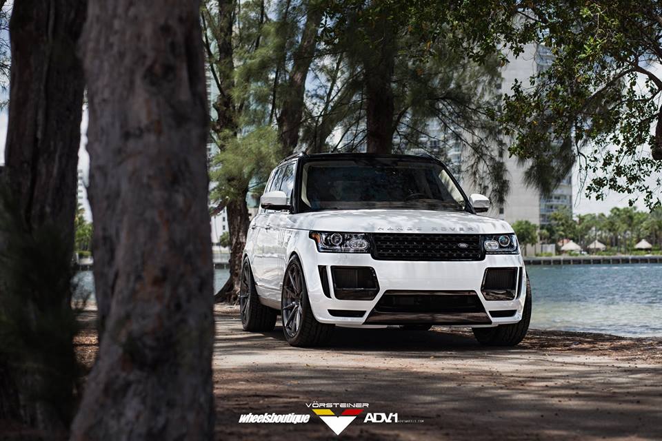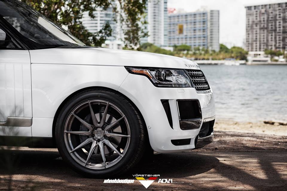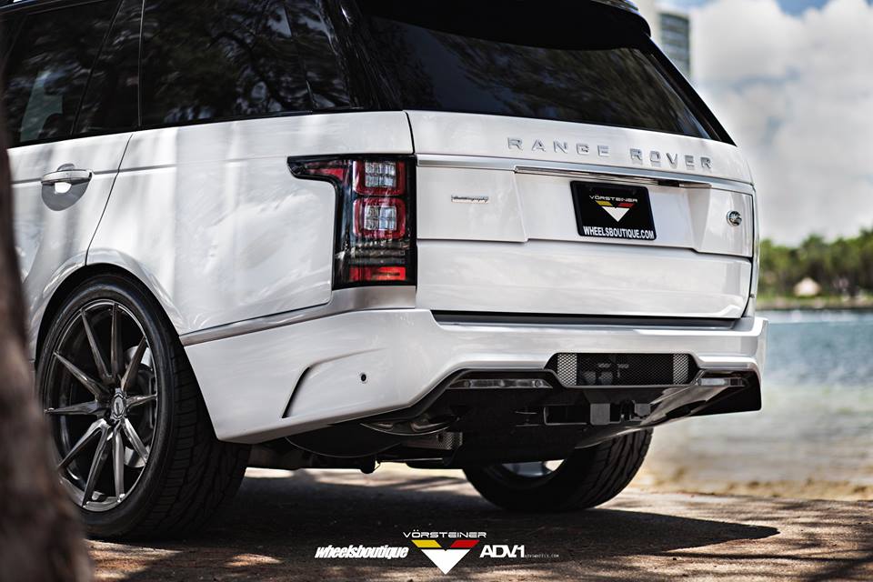 Vorsteiner Range Rover Veritas package consists mainly of a custom front bumper with extra large air intakes, lip spoiler, and carbon fiber grille inserts, a blacked-out front grille, side skirts with carbon accents, and custom rear bumper with integrated diffuser and tailpipes. The kit is complemented on this car with a set of custom 23 inch ADV10 wheels in gunmetal grey.