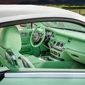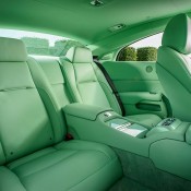 If you don’t like the one-of-a-kind shade of green this Roller is rocking on the outside, then you really should not step inside. Every single detail in side the cabin of Rolls-Royce Wraith Jade Pearl is drenched in that green – leather, veneer, lambswool floor mats, steering wheel, instrument dials, clock, even the speakers, vents and rear view mirror casing.