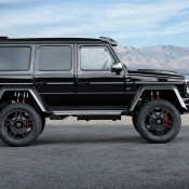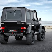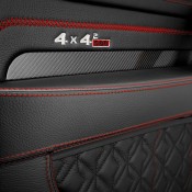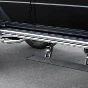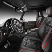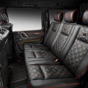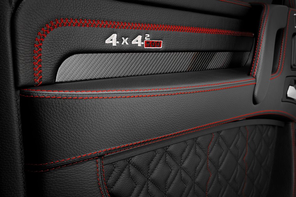 As for the exterior, Brabus Mercedes G500 4×4² looks substantially different from the standard car thanks to a number of mods, chief among which carbon fiber fender flares, Brabus grille and headlight bezel with integrated LED lights, a hood scoop, and underbody protection as well as Brabus wheels. There is also a set of powered side steps which is a welcome addition. Inside, new leather upholstery in black garnished with red stitching and accents plus sport pedals and Brabus door sills give the cabin a sportier feel.