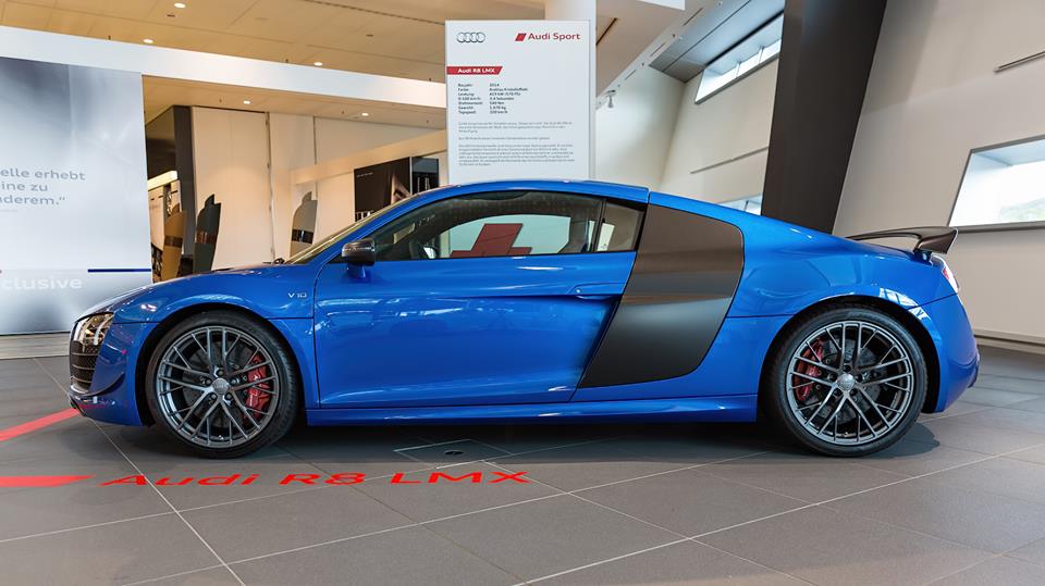 Finished in an exclusive Ara Blue and sporting a carbon fiber aero kit consisting of front spoiler lip, the flics on the sides, the engine compartment cover, the exterior mirror housings, the sideblades, the rear wing and the diffuser, all made of carbon fiber, this Audi R8 LMX is on display next to an R8 LMS fresh from the race track at Audi Forum Neckarsulm.