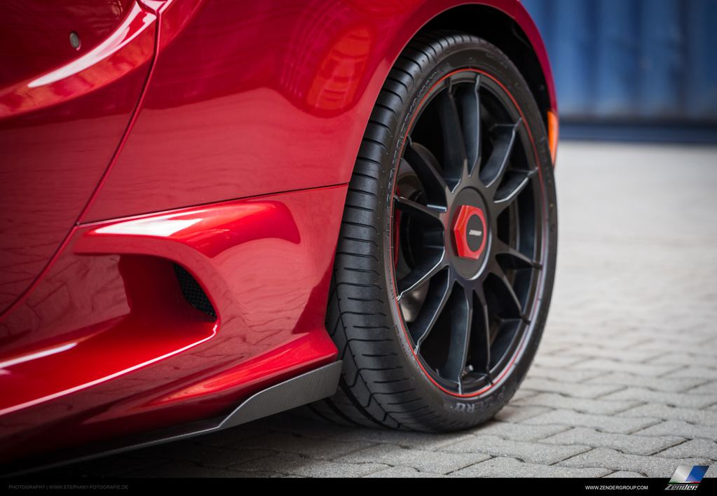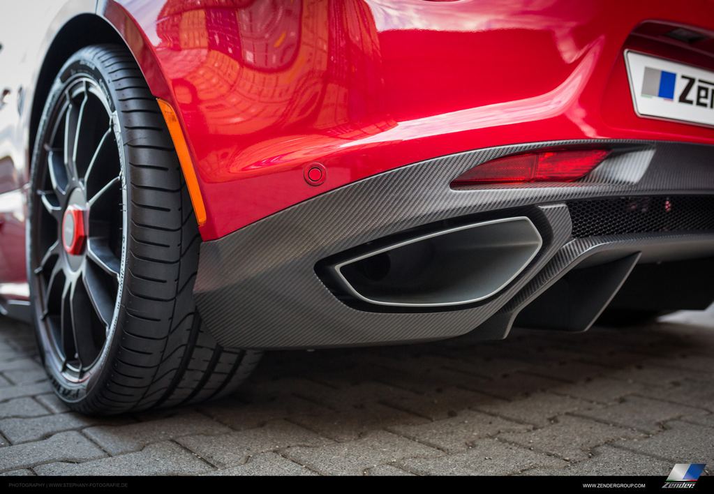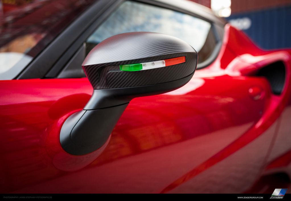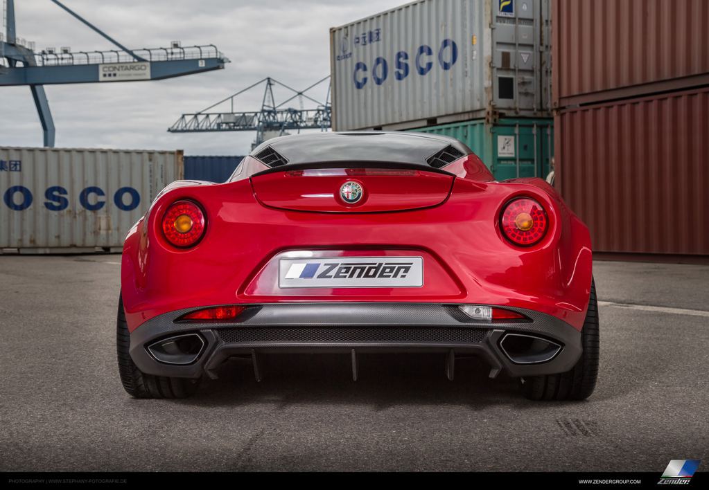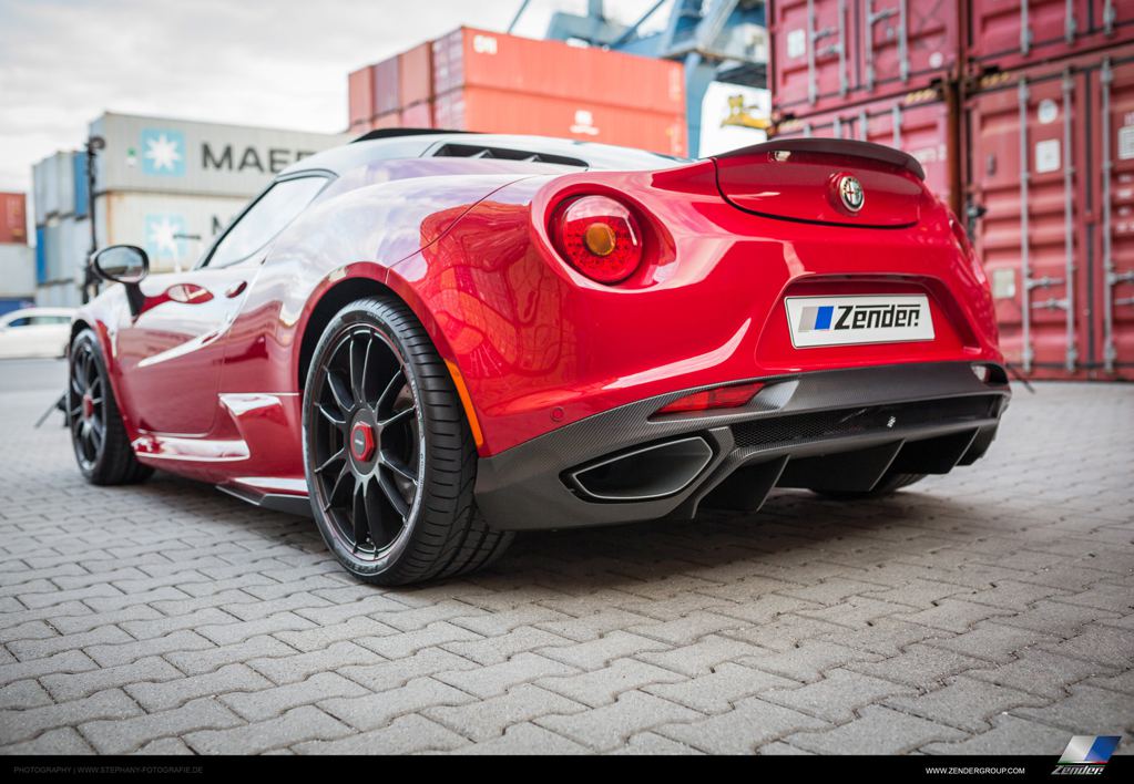 Unveiled at the 2015 Frankfurt Motor Show, Zender Alfa Romeo 4C features a revised front bumper with new spoiler lips and air ducts, new carbon roof and side mirrors garnished with the Tricolore, side flaps, a tiny boot lid wing, and a cool new diffuser with integrated tailpipes that give the car a whole new look at the back.