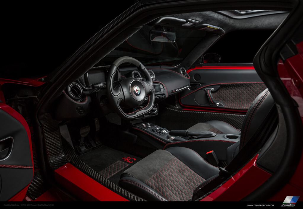 Zender has improved the interior of the Alfa 4C as well by adding more leather and Alcantara and red stitching. They have left the engine intact, meaning you get the standard 275 horsepower which delivers a 0 to 100 km/h time of 4.3 seconds and a top speed of 260 km/h.
