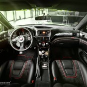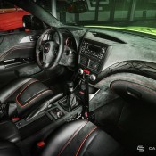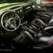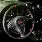 This kind of treatment is what Carlex does best. They can take a cabin as soulless as that of the Impreza and make it look like a Ferrari by covering every visible surface in leather, Alcantara, contrast stitching, and in this case interesting design patterns on trim pieces. You will find those patterns on the doors and dashboard, complementing the suede dashboard and steering wheel, and the two-tone leather and suede seats garnished with red accents.