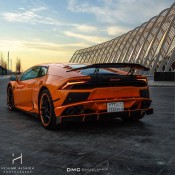 This one-of-a-kind DMC Lamborghini Huracan gets the full styling treatment with the custom carbon aero kit consisting of front spoiler, side flaps, side skirts with cup wings, rear bumper diffuser with integrated tailpipes, and the tall rear spoiler in SuperVeloce style. Furthermore, it gets a Performante stripe on the bonnet, carbon garnish around the air intakes, and of course, those eyeliners for the headlights.