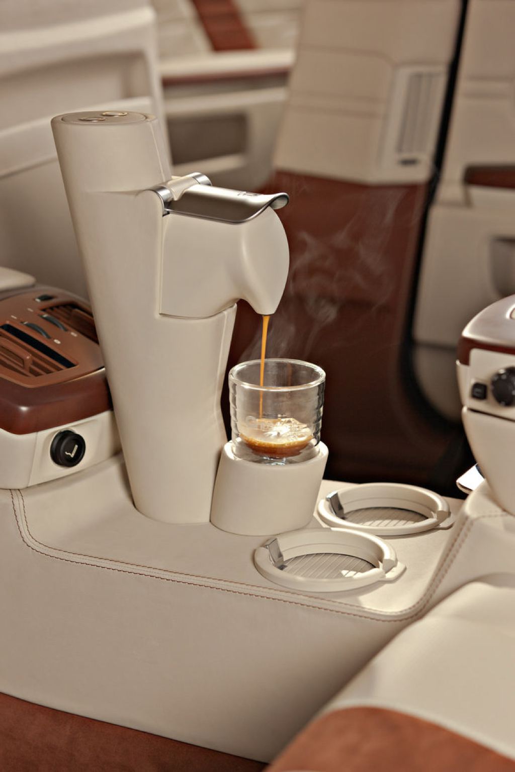 Another highlight of this car, and probably the coolest one, is an espresso machine integrated between the rear seats. There is a fridge as well, so the owner can choose between hot or cold beverages.