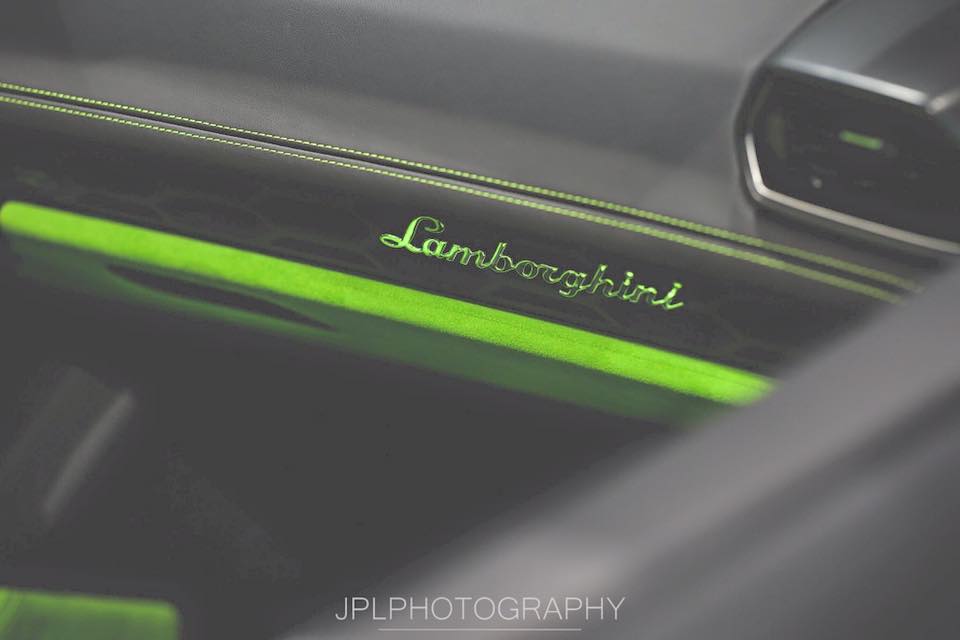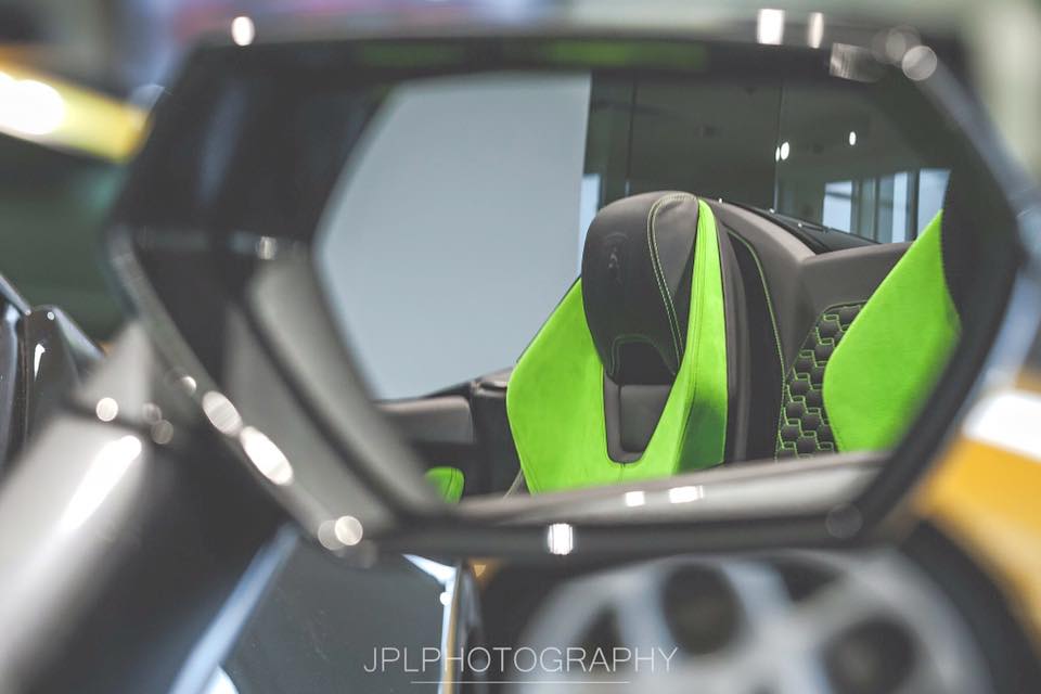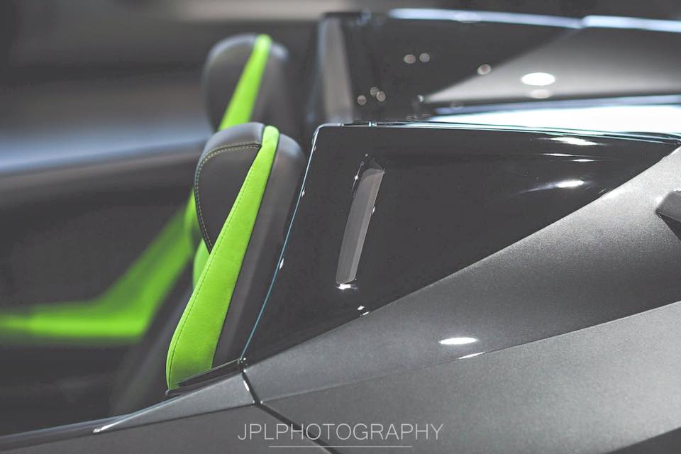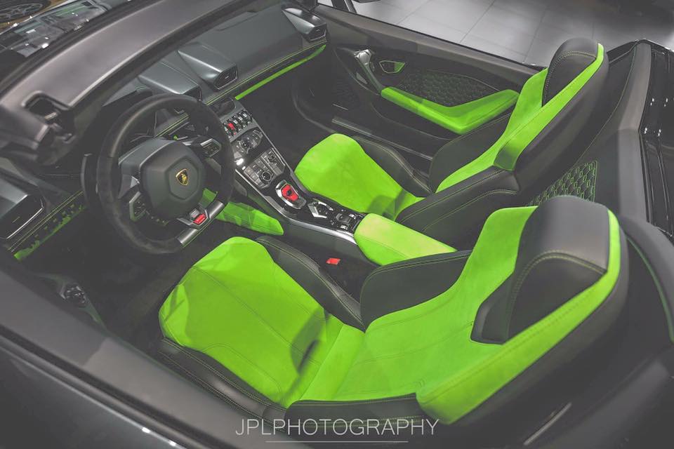 The Grigio Estoque Huracan Spyder features gloss black wheels and a custom interior with black leather and green Alcantara. The suede is used to create a lovely two-tone effect for the seat upholstery and also as accents on the dashboard, but its main function is in the super special stitching patterns – the famous Q-Citura design.