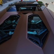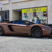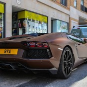 The Matte Brown Lamborghini Aventador, which we suspect is a wrap, certainly looks pretty unique. In fact it could very well be the only car of its kind in this color anywhere in the world right now. And the fact that it’s a Roadster means that it boasts, in effect, a two-tone finish, as the roof and pillars are exposed carbon fiber and the wheels are gloss black.