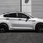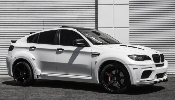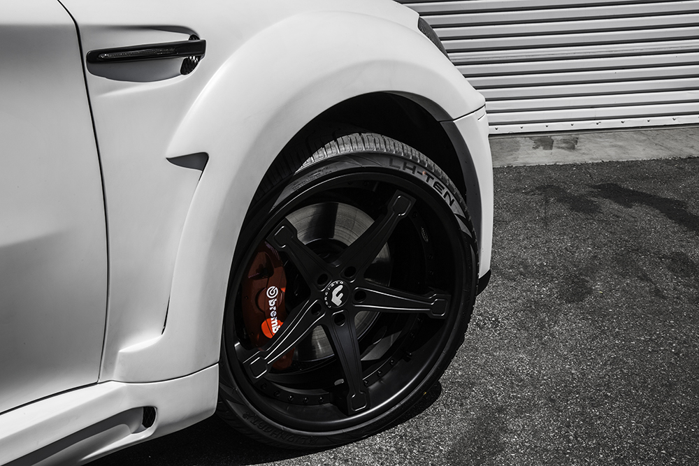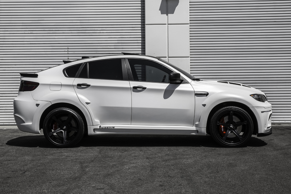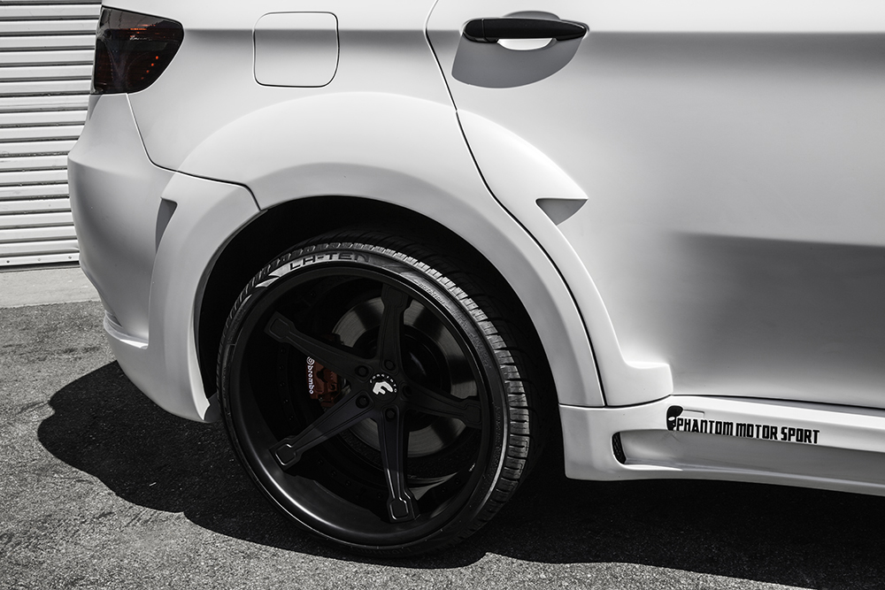 This particular custom BMW X6 has been fitted by Phantom Motorsport with a full Hamann wide body kit consisting of front and rear fender extensions, custom side skirts, revised front and rear bumper with exclusive front spoiler lip and rear diffuser featuring integrated central tailpipe. A roof spoiler and a tailgate wing, plus a sport vented hood, are among the other features. The kit is then complemented with a set of 22-inch Forgiato Martellato wheels in matte black.