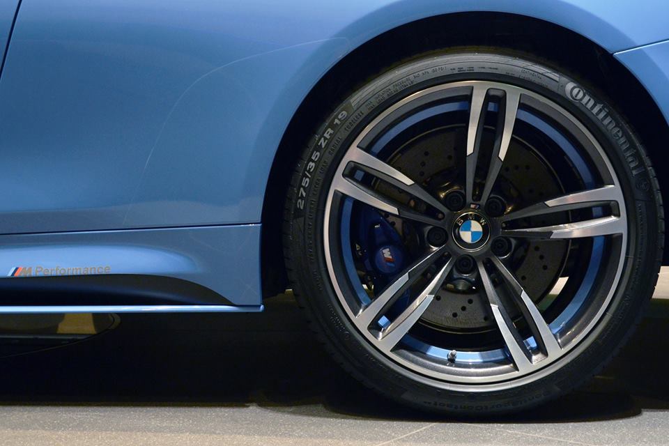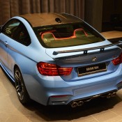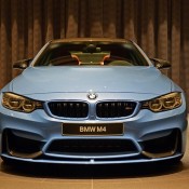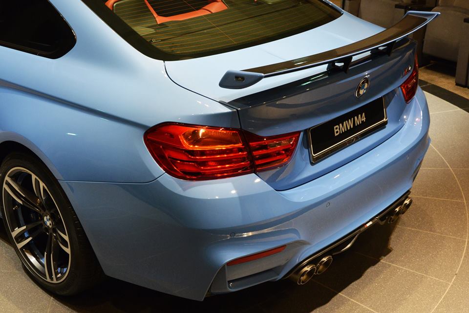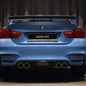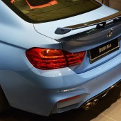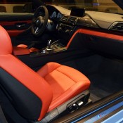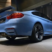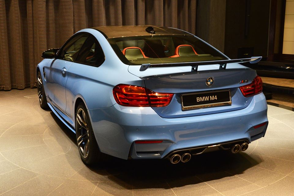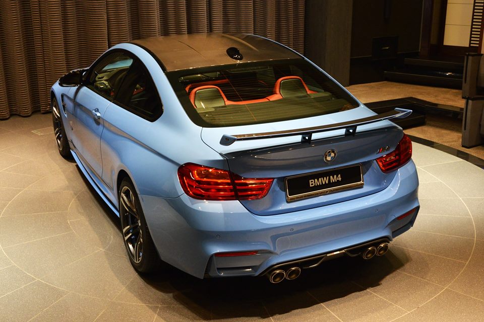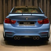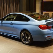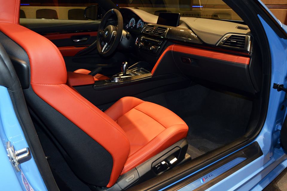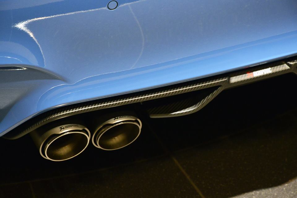 The exterior of this rather unique car is garnished with a M Performance front spoiler in carbon fiber, custom kidney grilles and mirror caps, plus M Performance side sill extensions. While this division also supplies wings and diffusers, this Yas Marina Blue BMW M4 is fitted with a diffuser from Akrapovic so that it can accommodate the tailpipes of the sport exhaust system, and it has also got an AC Schnitzer carbon fiber rear spoiler.