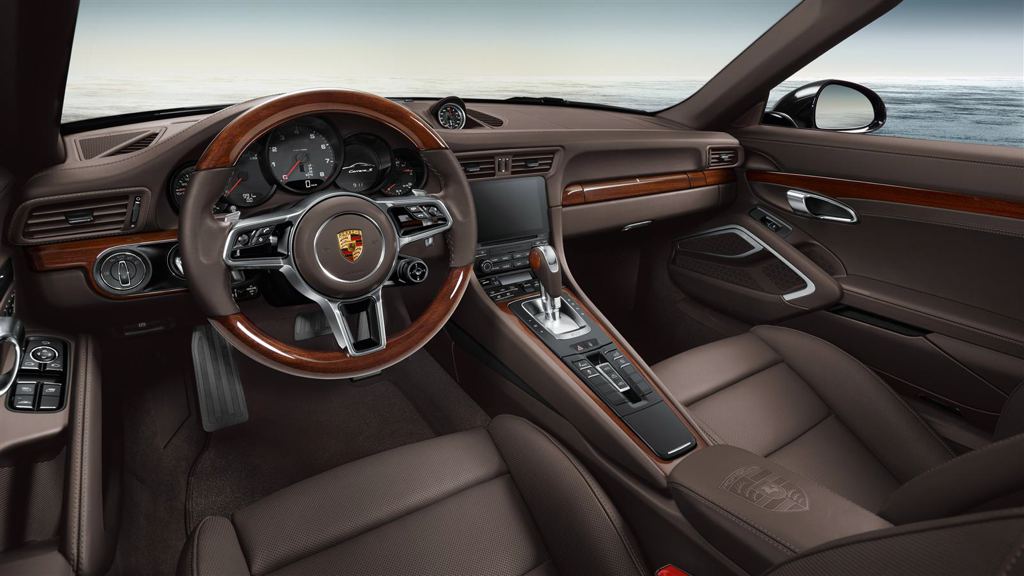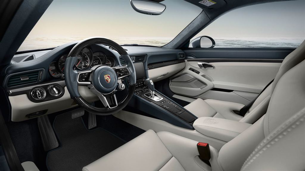 Inside, the main highlights include sport instruments in body color, storage compartment with Porsche logo, seat belt in body color, carbon fiber accented steering wheels and PDK gear lever, carbon floor mats with leather edging, carbon interior trim pack, and Sport Chrono clock in body color.