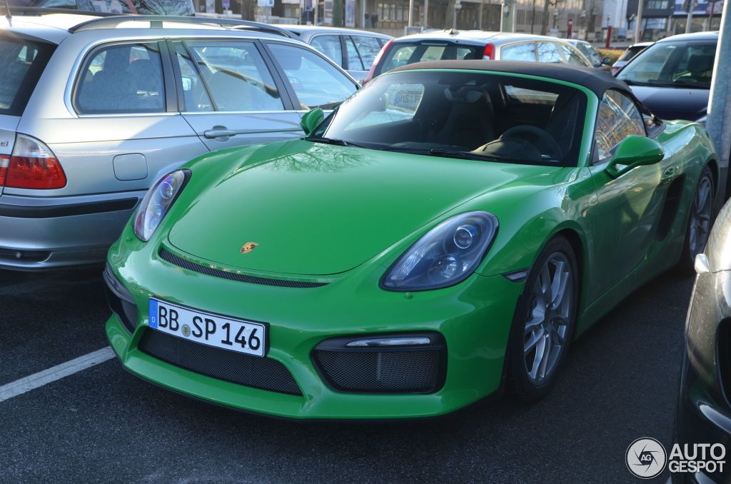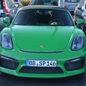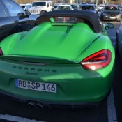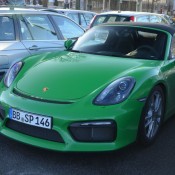 Pictured here wedged tightly between two other cars in a parking lot is one of the rarest cars in the world. This Viper Green Porsche Boxster Spyder 981 was caught in Essen, Germany, rocking an exclusive color retro-inspired color.