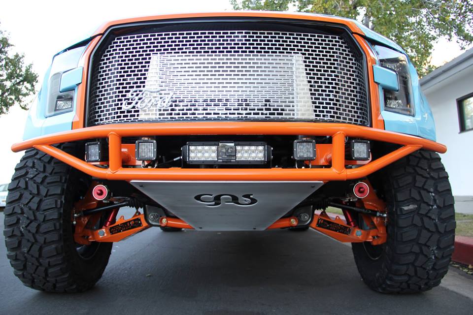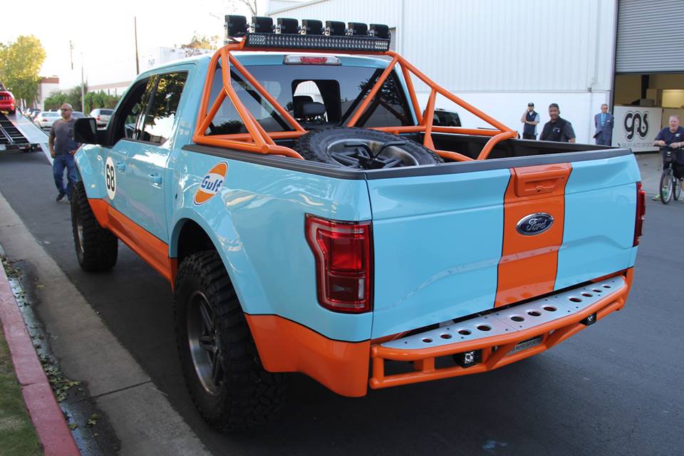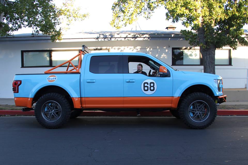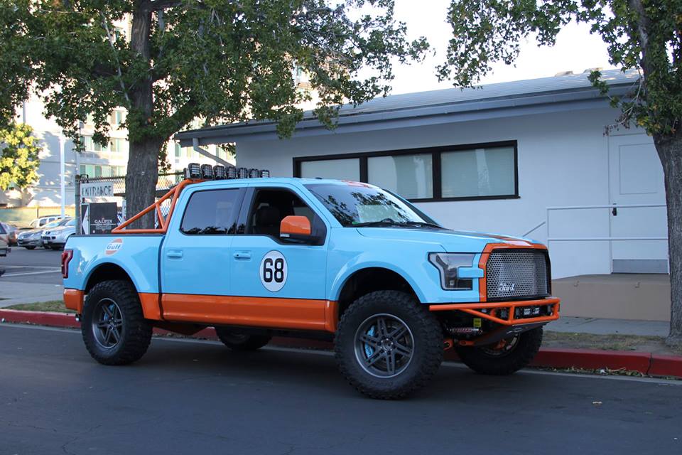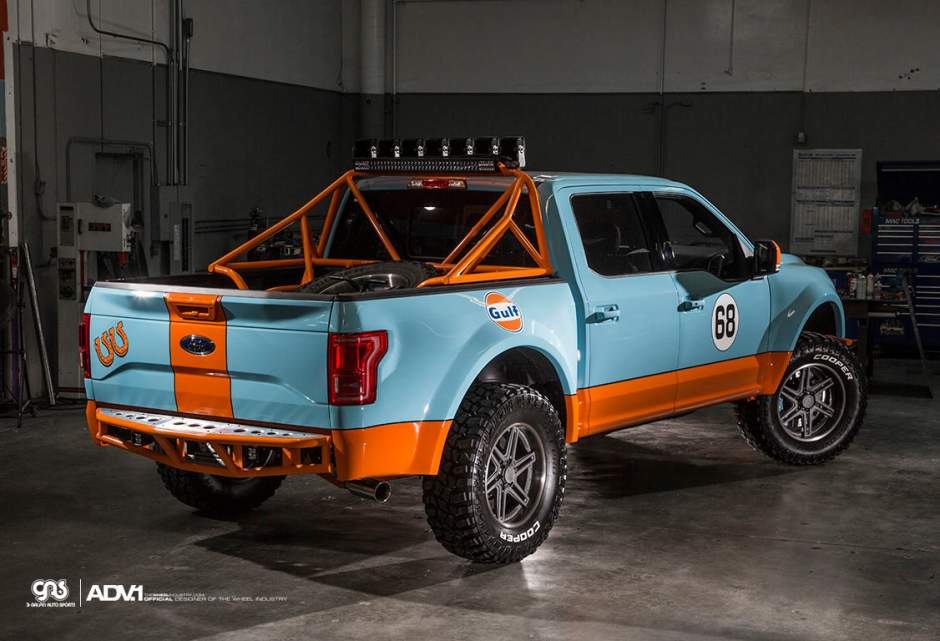 The guys at GAS created this truck as an homage to the Le Mans winning Ford GT40s of the yesteryear, hence the Gulf livery, and fitted it with a ton of custom components, most of which they built in-house. Gulf F-150 is fully kitted out for off-road work, what with the custom suspension, roll bar, front and rear guards and railings, and off-road wheels and tires.