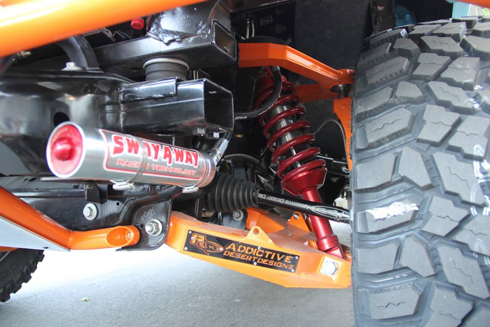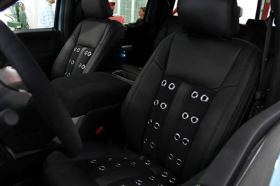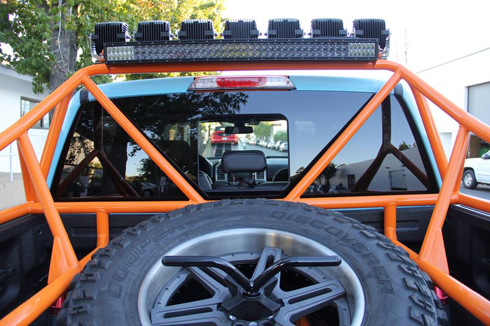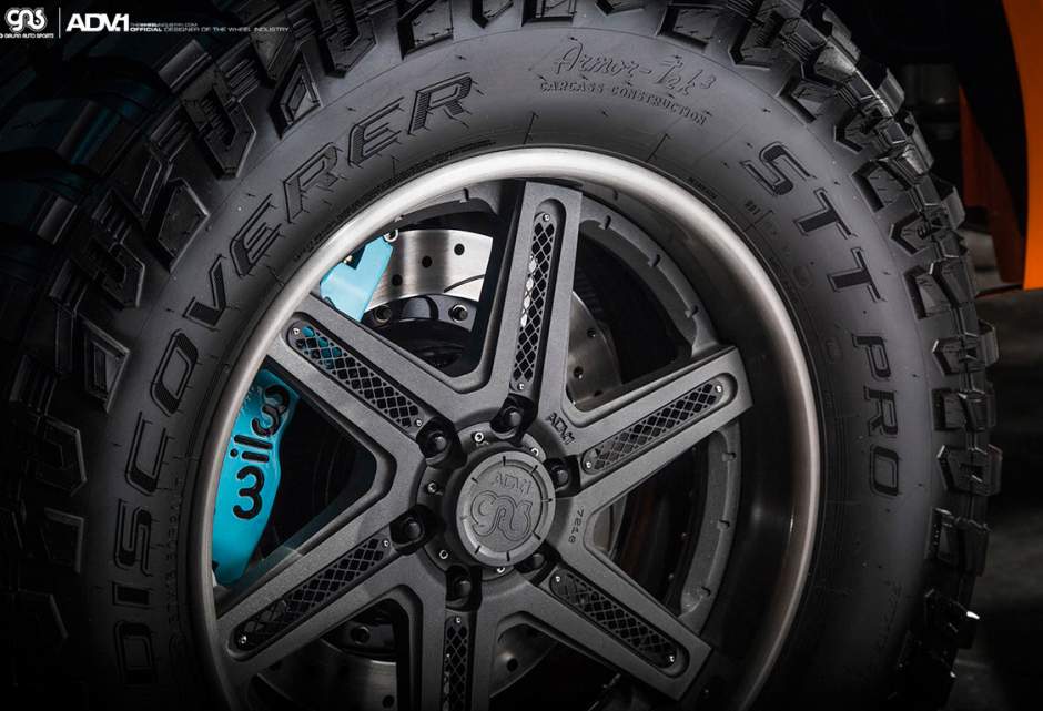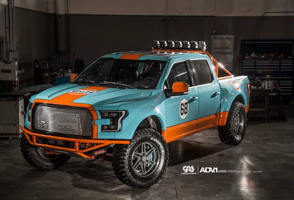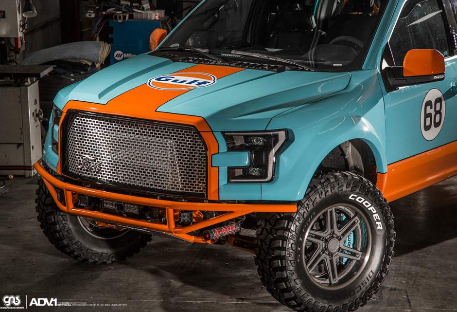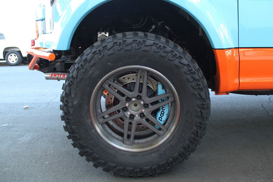 Our favorite highlights of this awesome truck include the Gulf wrap, obviously, the front grille and what they have done with the front bumper, the spare wheel arrangement, and the interior with the GT40-inspired seat covers. The wheels on this truck are ADV06RM Truck Spec Light Duty models in gunmetal grey in size 20 inch, and they are supported by Cooper off-road tires and Wilwood brakes.