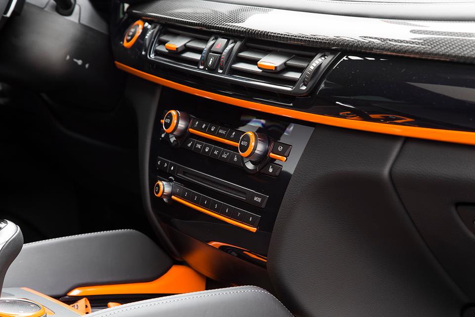 In terms of technical upgrades, Orange Crush BMW X6M is equipped with H&R lowering springs for a sportier stance, de-valved exhaust for a more sonorous sound, and Dinan power kit for more oomph from the engine. The standard 4.4 liter bi turbo V8 engine in the X6M develops a not at all shabby 560 horsepower. With the modifications applied to it in this program, that figure should now be close to six hundred.