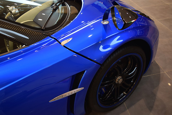 That is a high-end showroom in Saudi Arabia, determined to collect the world’s very best hyper cars. Their Pagani Huayra Chassis #001 is finished in blue carbon with white accents and black carbon sills and aprons. It also features black wheels with blue outer lips, and a white and blue interior.