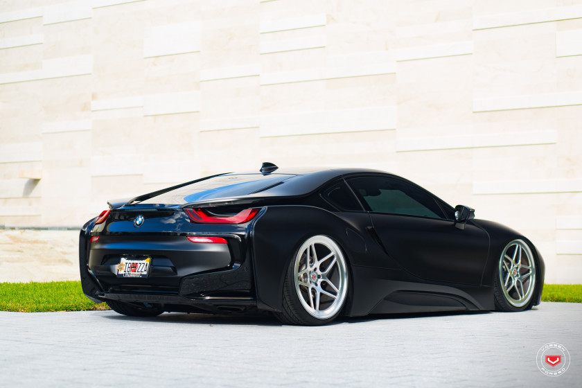 Besides looking good itself, what that air suspension system does is slam the i8 to the ground, and that’s where those Vossen wheels come to play. The Vossen Forged LC Series LC-104 wheels are fully polished with a clear powder coat to make a nice contrast with the dark finish of the body. They measure 22×9 up front and 22×10.5 out back.