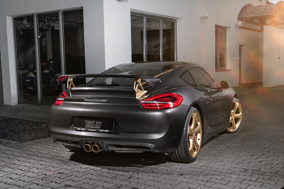 Adorning your car, especially a sports coupe, with gold accents more often than not results in a ghastly look. But in the case of this Techart Cayman GT the color is used in strategic places to convey a feeling of luxuriousness without turning the car into an eyesore. Granted, the massive golden rims are a bit too much, but the golden struts of the rear wing and the golden tailpipes are nice touches and make a cool contrast with the Agate Grey finish of the body.