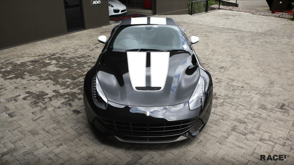 While all the body panels remain intact on the Ferrari F12 by RACE!, a few strategic changes have increased the car’s visual impact tenfold, making it miles more aggressive and sporty. The first thing you’ll notice upon laying eyes on this bad boy is the white stripe package, adorning the bonnet, rear tailgate, roof and side mirrors. The double white stripe makes a nice contrast with the metallic black of the body.