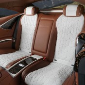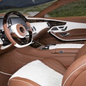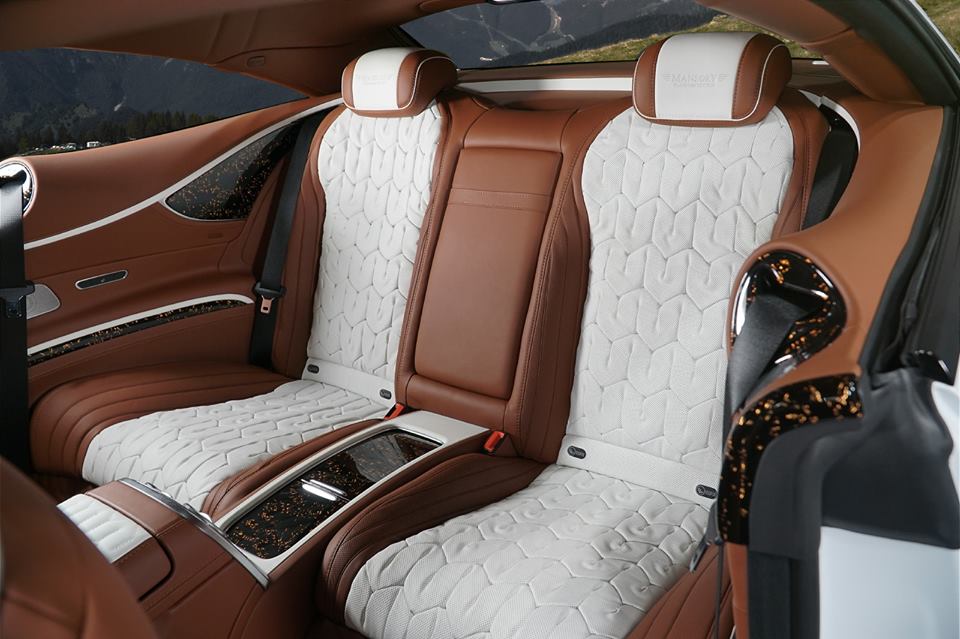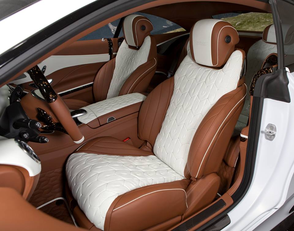 The Platinum Mansory Mercedes S63 Coupe dispatched to Geneva boasts what the tuner calls the ‘soft’ styling package. It’s still a heavy treatment by other people’s standards, consisting of a carbon front spoiler and bumper garnish, vented bonnet, massively flared wheel arches, vented front wing, side skirts, rear diffuser insert and rear tail spoiler, all in carbon fiber.
