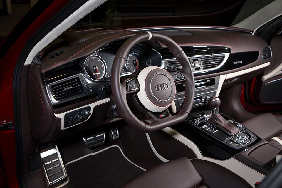 The main highlights of ABT Audi RS6 Individual, in terms of visual features, include a candy gloss red paint work, gunmetal turbine wheels, and a subtle version of ABT’s aero kit sans the naked carbon flaps and winglets we are used to seeing on their normal models. The car also comes with a unique interior featuring gorgeous brown leather complemented with contrast stitching, beige inserts, and Piano Black trim pieces, as well as sport steel pedals and fancy floor mats.