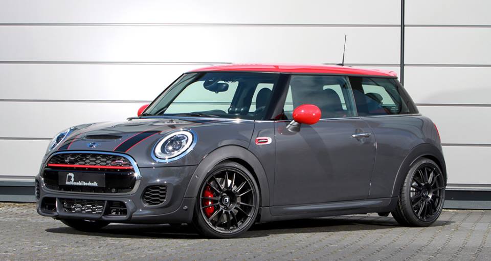 Stage 1 upgrade for B&B MINI Cooper JCW offers a boost to 272 horsepower with 400 Nm of torque and costs 1,298 euros. Stage 2 ups that to 286 horsepower with 430 Nm for 1950 euros. What you want though is the full-fat 300 horsepower and 465 Nm which costs 3,950 euros but drops the 0 to 100 km/h time from the standard 6.3 secs to 5.4 secs and ups the top speed from 246 km/h to over 280 km/h.