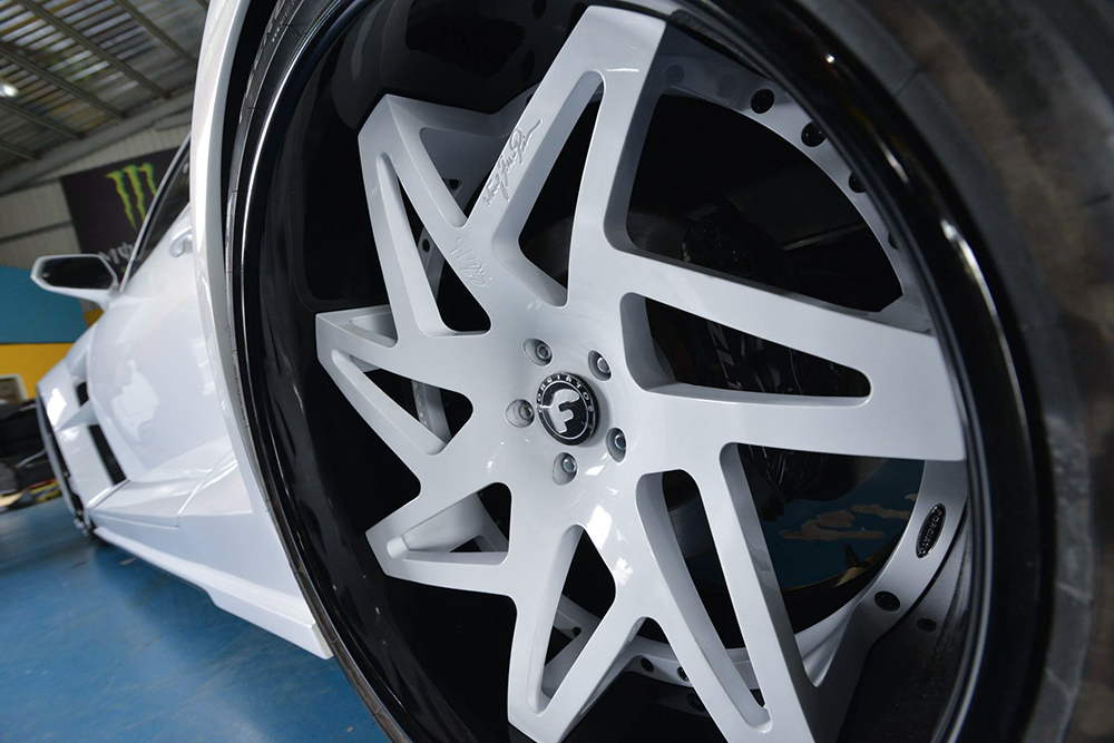 The extreme makeover this Camaro has been given begins with a new front bumper featuring massive intakes and grilles, complemented on top with a new hood and on the sides with some comically large fenders which join hand with a similar pair at the back through massive new sills. A set of set of huge Forgiato Finestro-ECL rims in white complete the look.