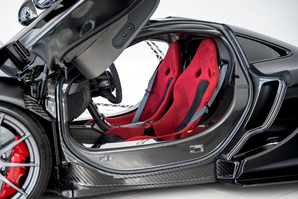 It’s a good one, though. This matte black McLaren P1 is a MSO’d up example now on sale at Dutch luxury car dealership Louwman Exlcusive with just 550 km on the clock. It comes with a factory matte finish with painted carbon parts, red brake calipers, and matte wheels, plus a custom interior featuring two-tone red and black Alcantara seats instead of the regular leather seats. This car is one of the most aggressive-looking P1s ever to come out of Woking… at least until you open the doors!