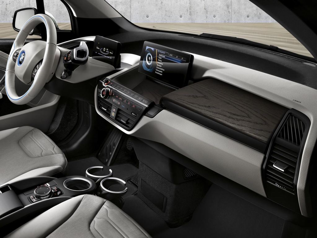 BMW i3 94Ah comes in a Protonic Blue with Frozen Grey metallic accents borrowed from the i8, but you can customize the interior with stuff like Neutronic cloth in Aragats Grey with BMW i Blue highlights and Dark Oak and eucalyptus wood trim. Prices (in the UK) start at £27,830 for the regular and £30,980 for the Range Extender model.