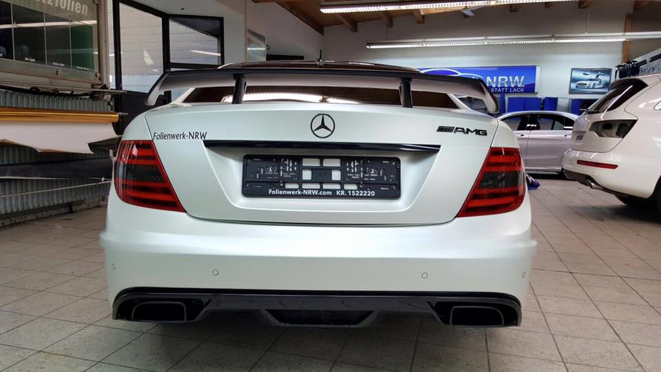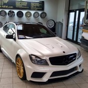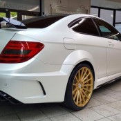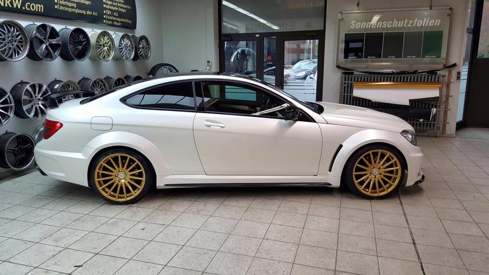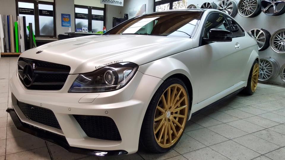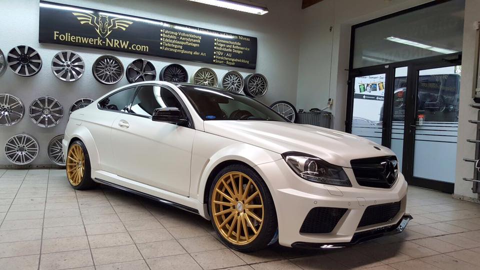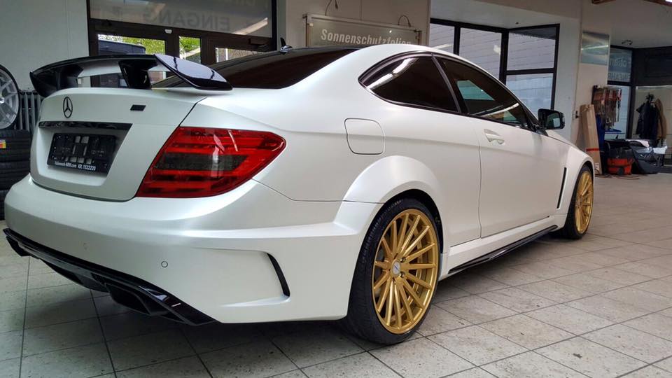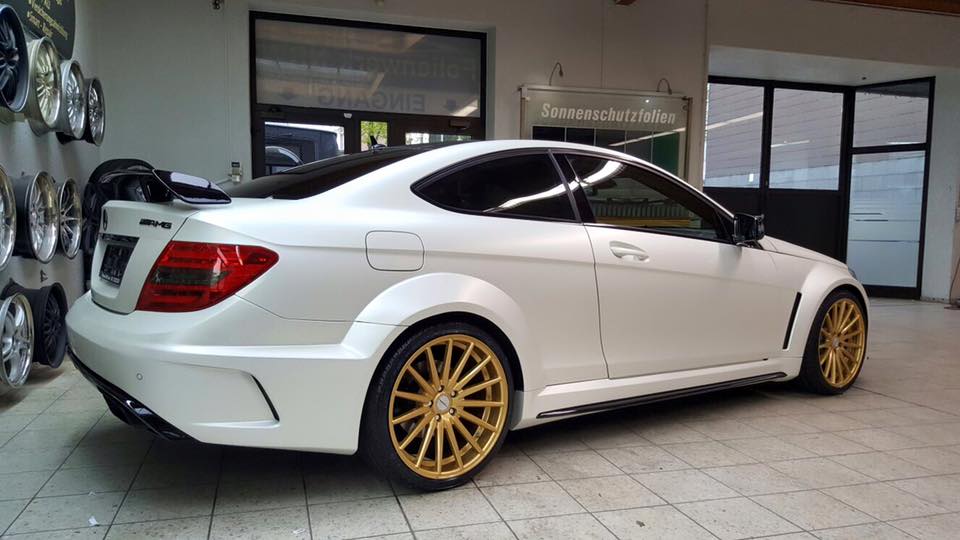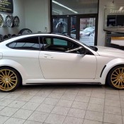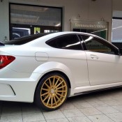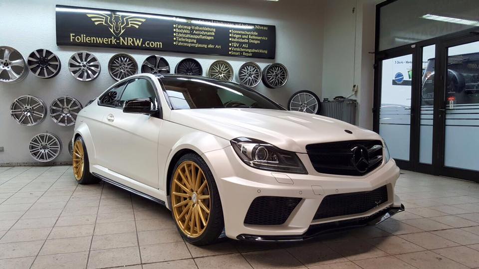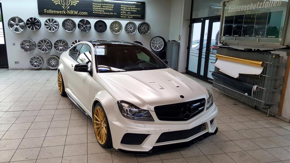 Prior Design Mercedes C-Coupe Black Series has also received a lovely matte pearl white wrap from Folienwerk-NRW in addition to a set of 19-inch wheels finished in gold. Despite the plastic surgery, the mascara, and the jewelry, we have to say this C-Class is still far from charming. It still looks awfully outdated, which is a pity because C350 is a good driver’s car.