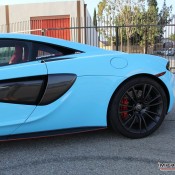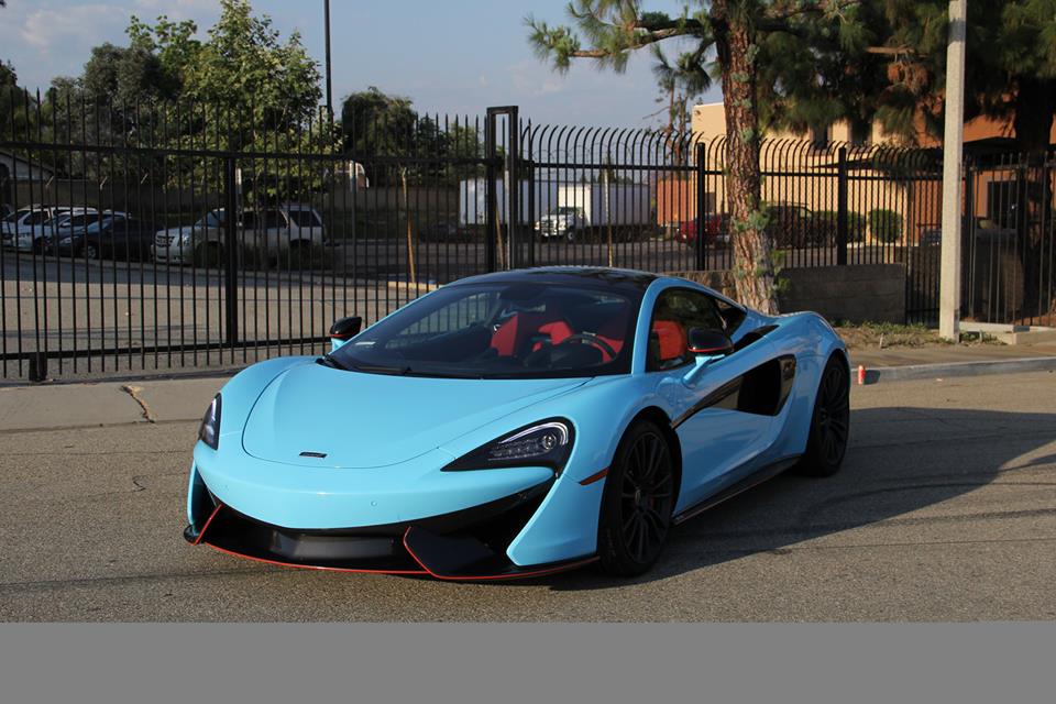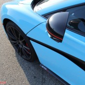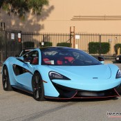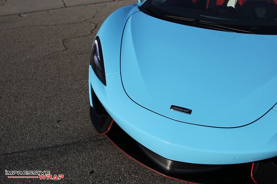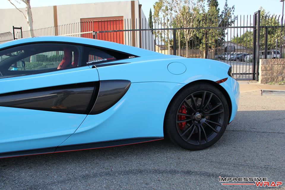 Wrapped by Impressive Wrap, this Sky Blue McLaren 570S features a cool glossy finish that looks its best under direct sunlight. On this car the sky blue – also known as baby blue – is complemented with stock black accents of the McLaren and some subtle red detailing which is really nice. Blacked-out roof and wheels, red brake calipers, and a red interior are among the other notable highlights of this car.