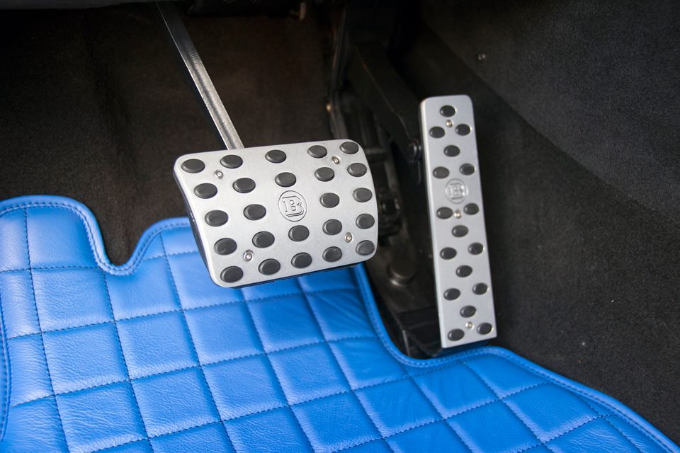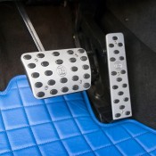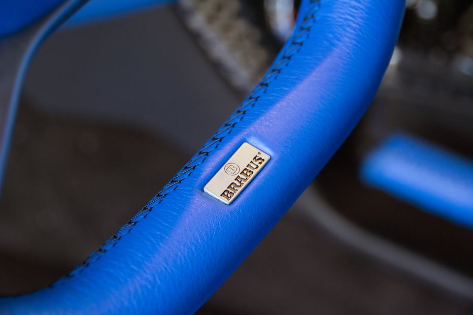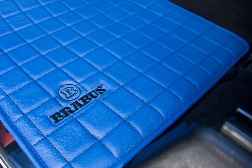 The blue leather is then complemented with black stitching which has been used liberally to not only piece various bits together, but also give them a nice design patterns and show off the tuner’s logo wherever there was space for it. Adding to the drama of the design is a few select pieces of carbon fiber trim with big chunky weaves in keeping with the size of the car, and a set of Brabus steel pedals.