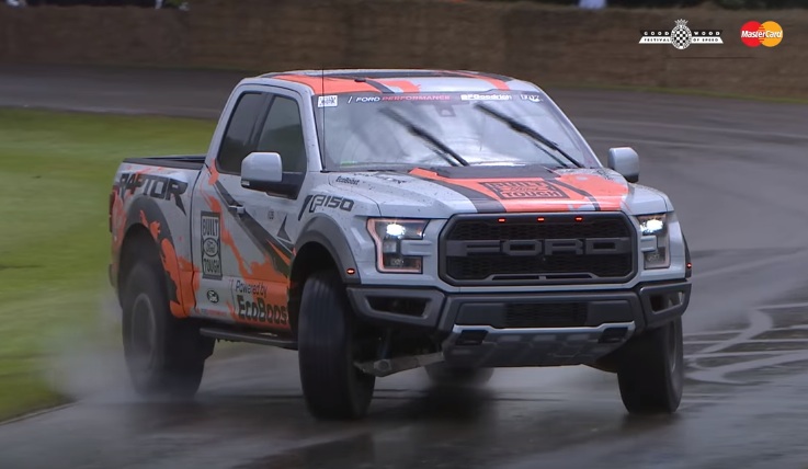 Granted, it was pouring with rain when Collins, a GFoS regular, took the wheel of the Ford F-150 Raptor. But then again, he lost it in a straight line. We’re not suggesting the driving skills of the former Stig, who also used to train Special Forces in the art of evasive driving, have diminished or anything. What we’re suggesting is there is no place on the Goodwood hill for a massive truck. The damn thing barely fits on the tarmac: