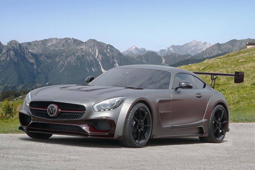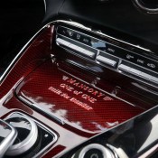 The all-consuming rear wing on this Mansory Mercedes AMG GT has a maroon red carbon fiber finish like the rest of the aero kit which includes a revised rear diffuser and front spoiler lip complete with bumper inserts. The flared arches, the vented hood, the extended sills and the rest of the body are matte-finished black carbon, complemented with a set of 21 inch “7spoke” Mansory wheels.