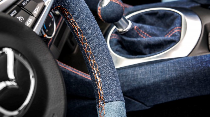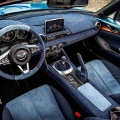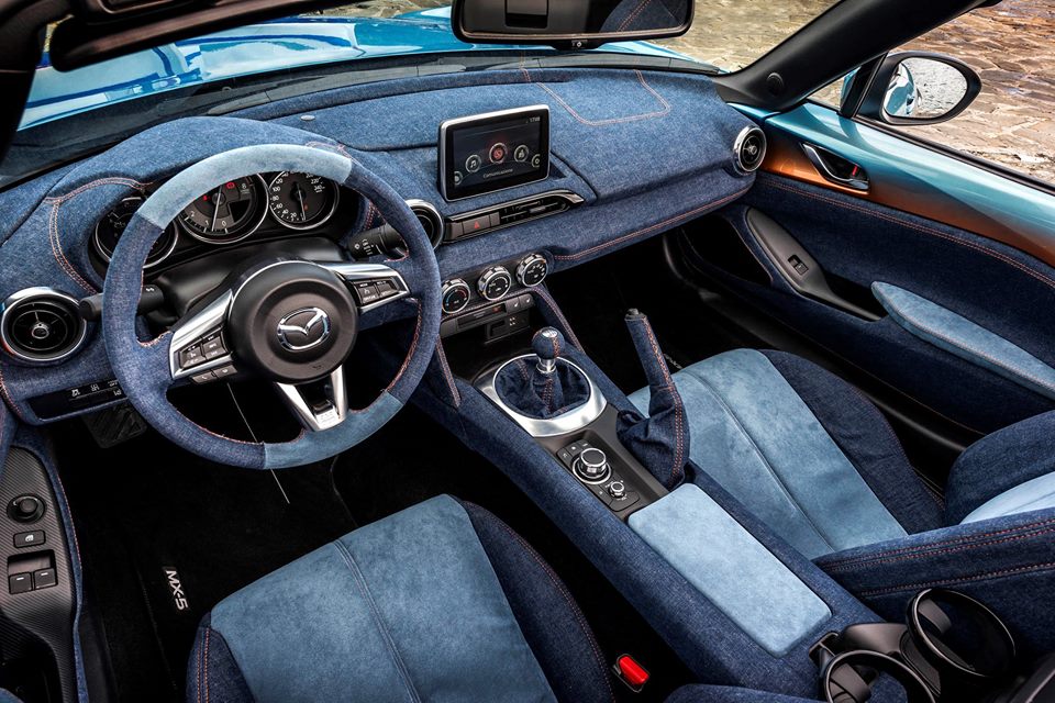 The best part of Mazda MX-5 Levanto, and one that could actually become a popular aftermarket treatment, is a full Denim interior. You find the material on the seats, dashboard, steering wheel, and door cards, complemented with more brightly colored nautical Alcantara and red stitching throughout. As with the standard MX-5, the top of the doors are painted in the same two-tone finish as the exterior.