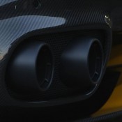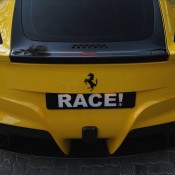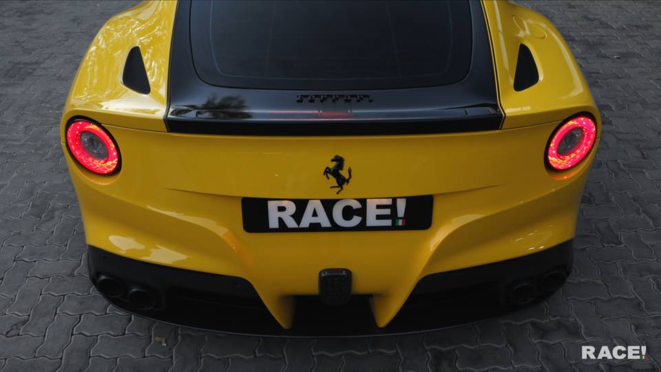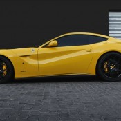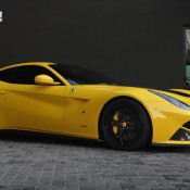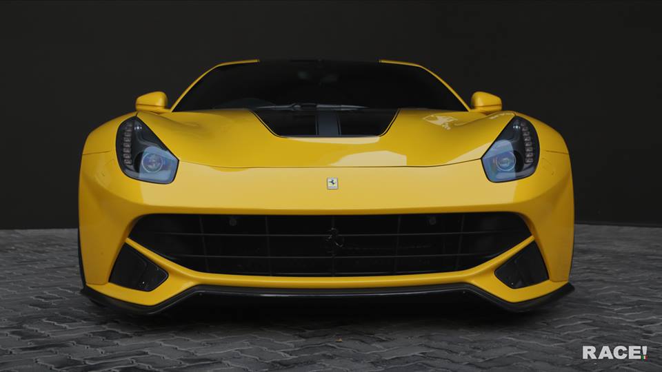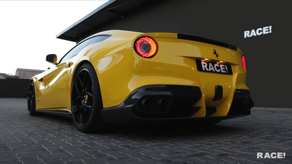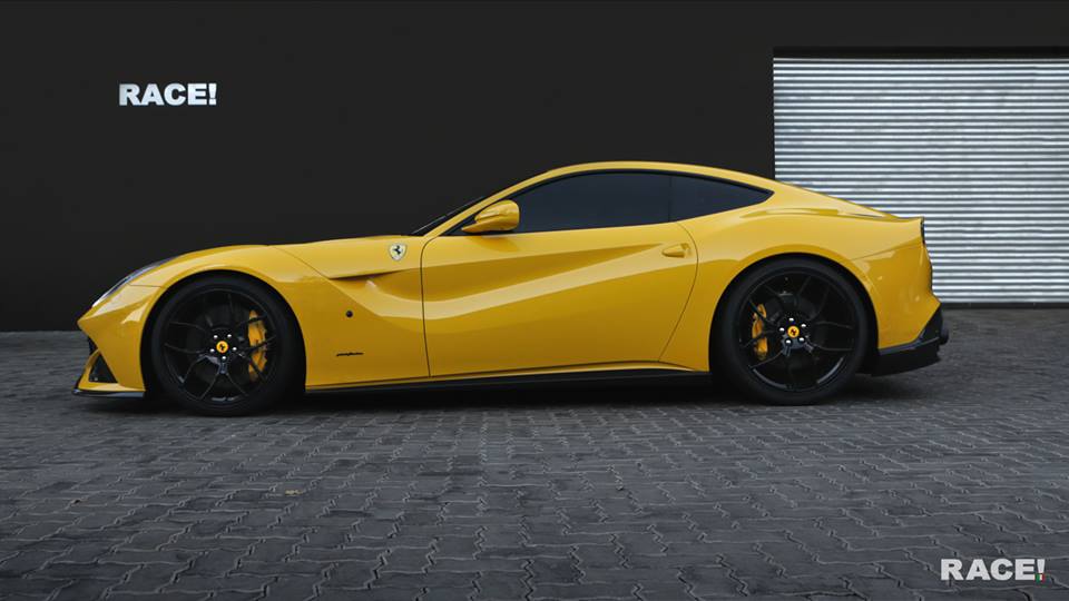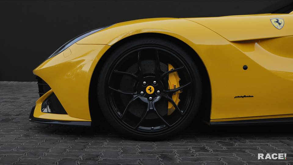 What you get with Novitec Ferrari F12 by RACE! is a set of nice carbon fiber components for the body — including front spoiler lip, side skirts, and rear diffuser, a set of Novitec wheels in sizes 21 inch front and 22 inch rear, and Novitec KW lowering springs. There are a few touches by RACE! themselves, such as the yellow brake caliper,s tinted windows, and the graphics package with the black accents which make a nice contrast with the Gialo paint work and give the car a sportier look.